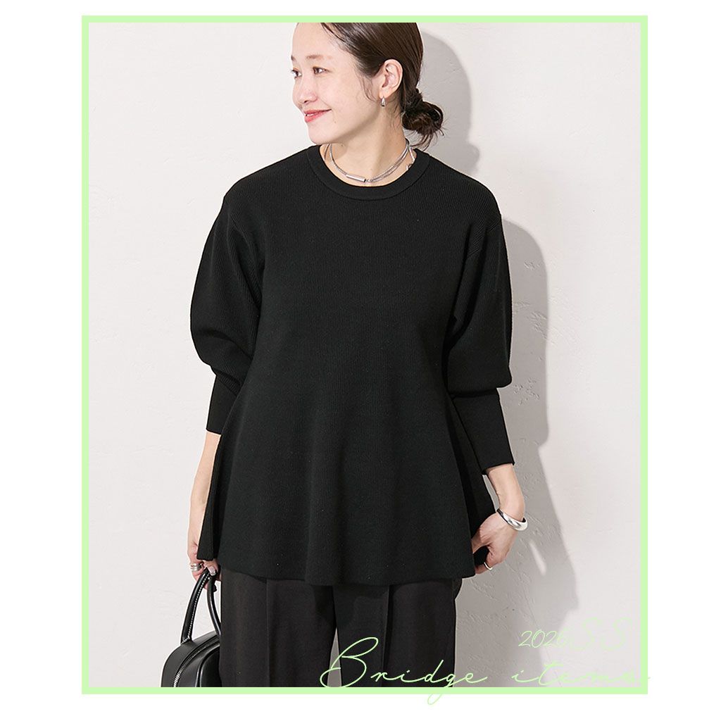 計算された立体的な編み地が、女性らしいメリハリのあるラインを描くペプラムニット。