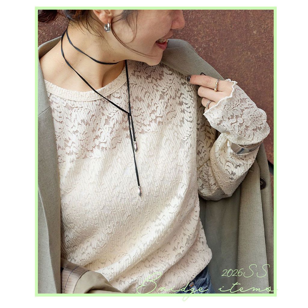 スタイリングのアクセント付けにぴったりのレースアイテム。インナーに、ハイネックを合わせて着こなすのも◎