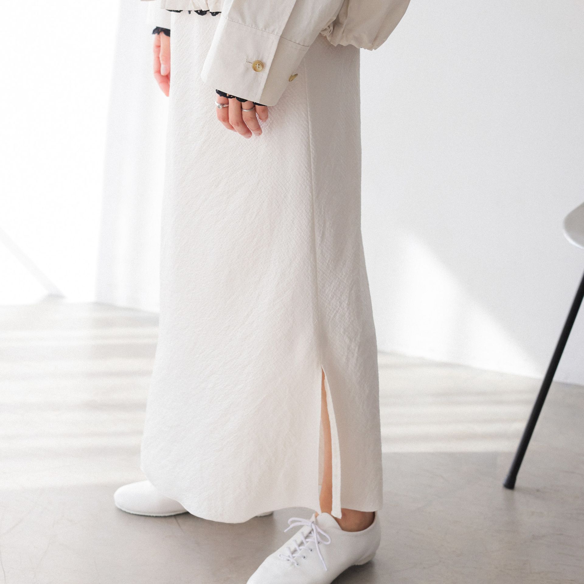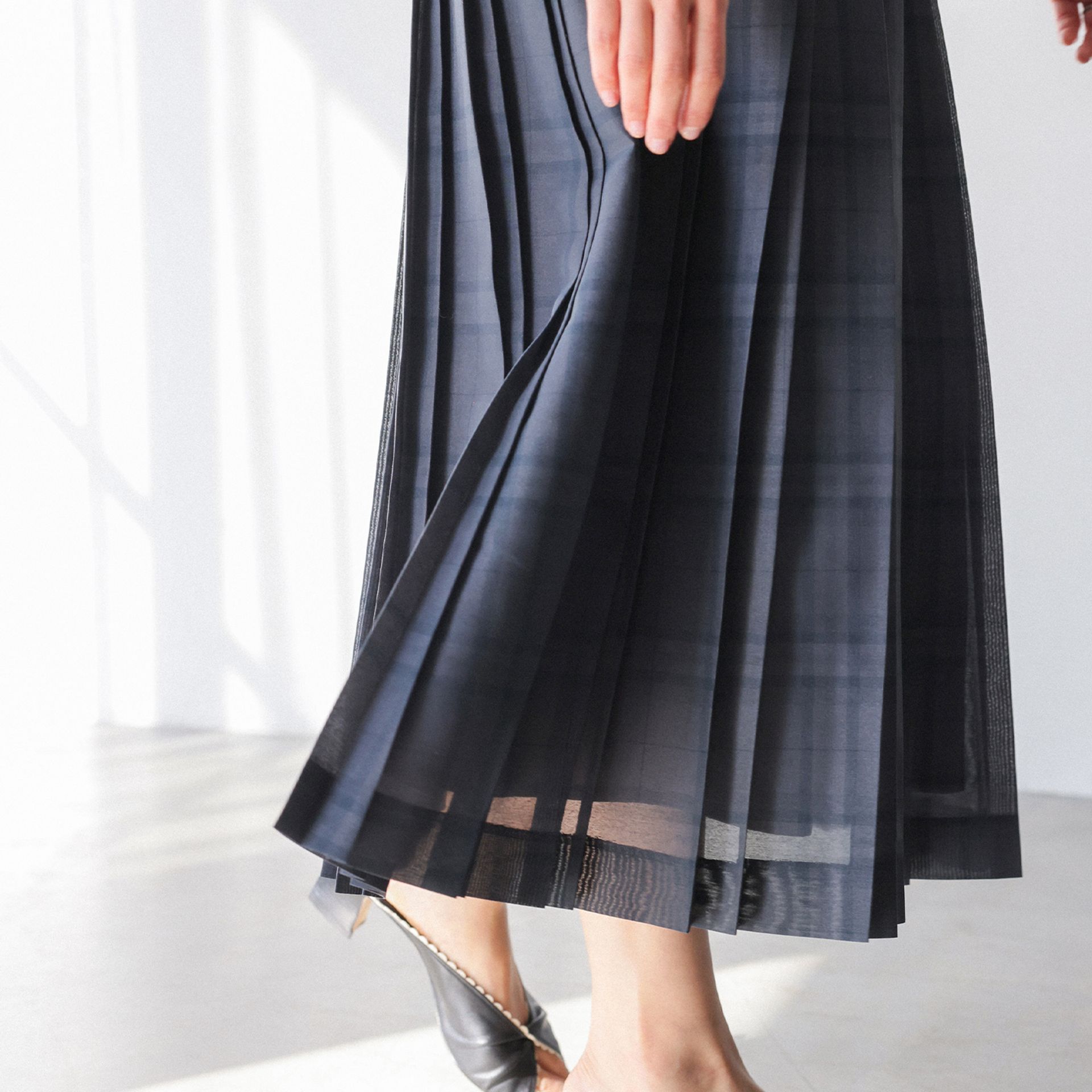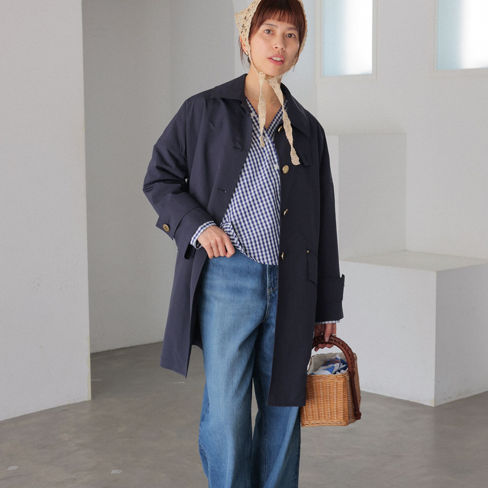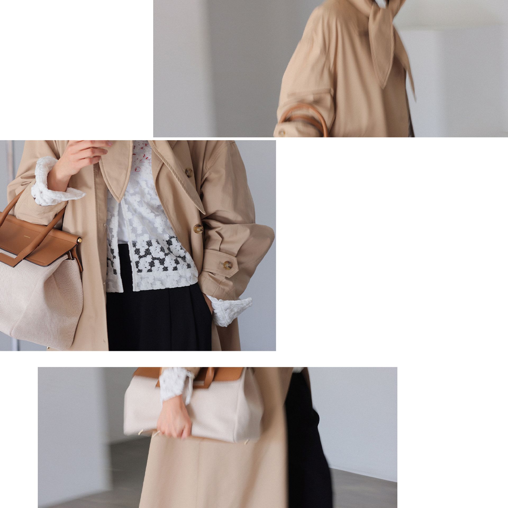 主役はコートの軽やかな素材感。小物も軽さのあるアイテムで揃え、季節を先取りした印象に。デニム合わせで程よくカジュアルに、インナーのブラウスはウエストアウトすることで気負わない大人のバランスに。