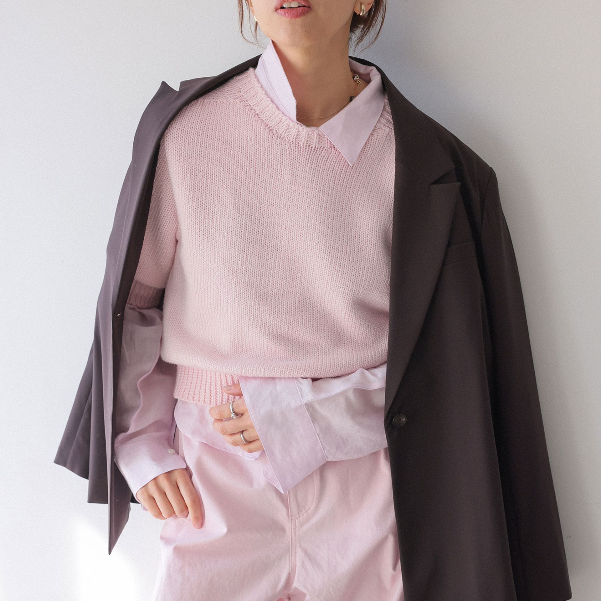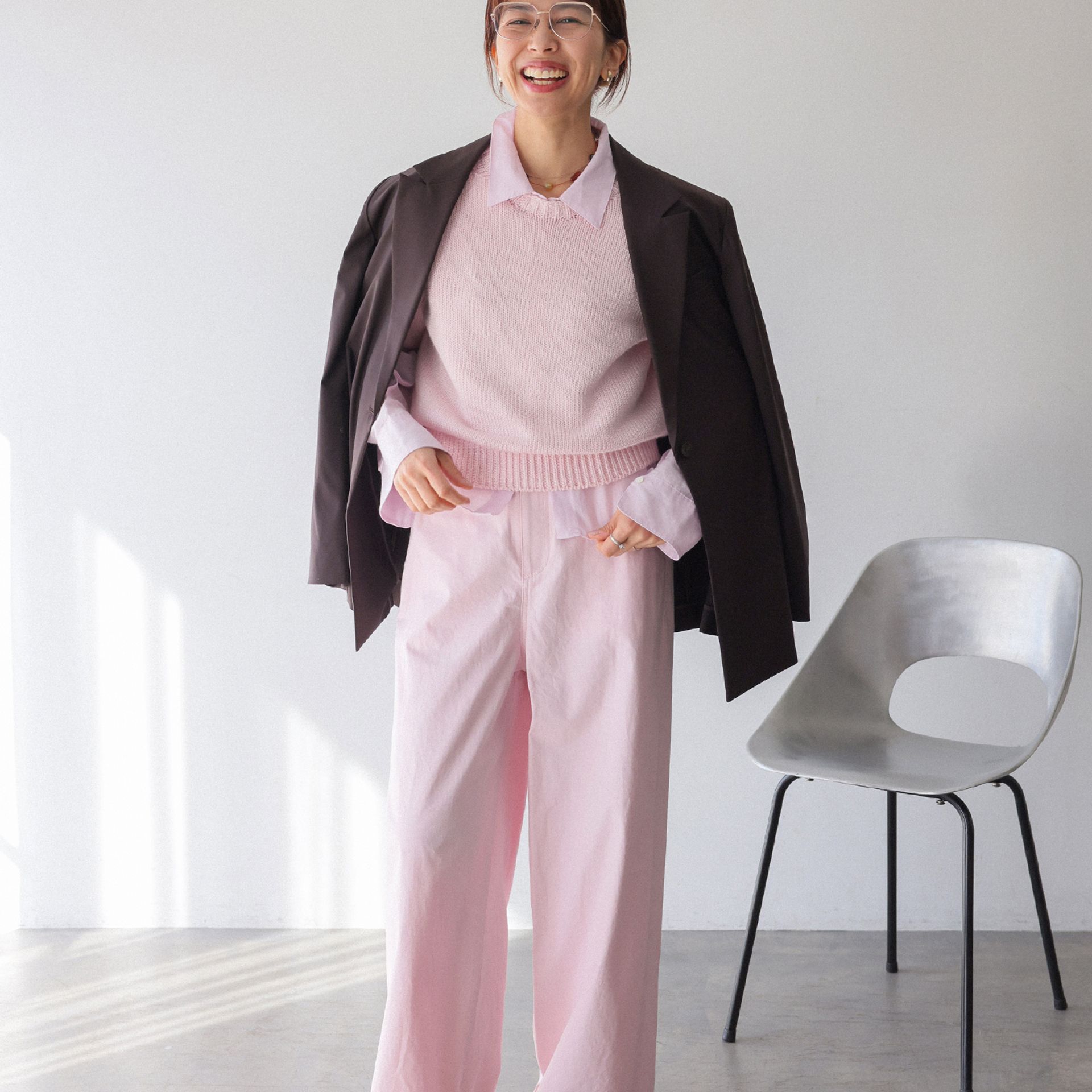 主役はブラウンのジャケット。ピンクのワントーンに重ねることで、全体を引き締めつつ甘さを程よく抑えて。シャツはウエストアウトでラフに。襟元も綺麗に整えすぎず、少し崩すのがこなれて見えるポイント。