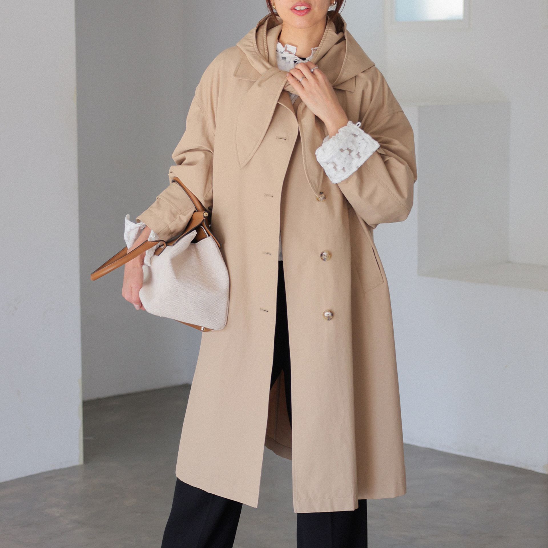 ミドル丈コートは、パンツでもスカートでも楽しめる万能アイテム。インナーには赤ロゴのTシャツを仕込んでアクセントを。袖口からは、レースを覗かせてベーシックなコートスタイルに女性らしさをプラス。付属のフードを被ってフレンチシックに仕上げるのもおすすめ。