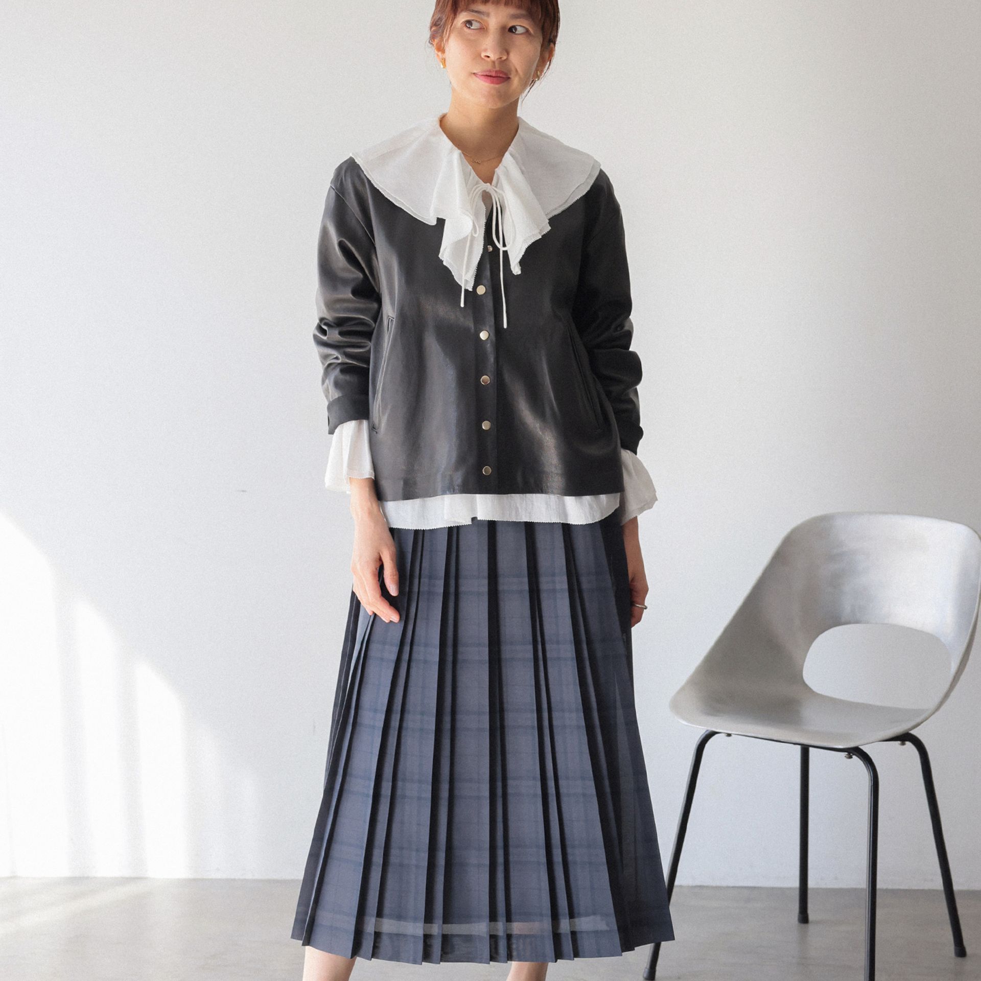 レザーの辛さと対照的な甘めなフリル、プリーツ、サンダルを合わせた甘×辛スタイル。レザーブルゾンのボタンは全て留めて、襟元や袖口からシアーフリルブラウスを覗かせる。素材のコントラストをつけることで、シンプルながら奥行きのある印象に。