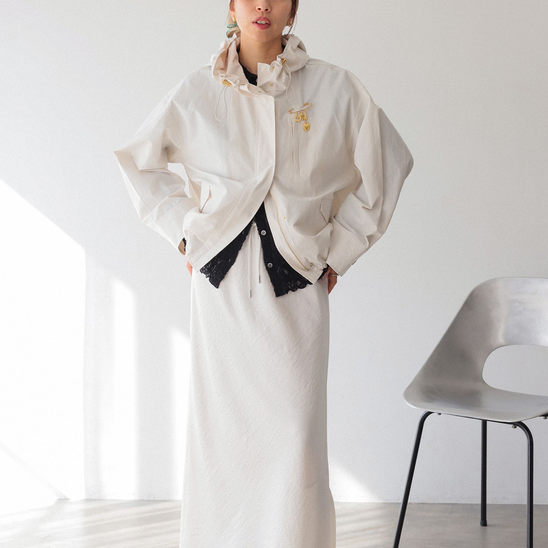 ホワイトのワントーンは、ブラックを効かせてメリハリを。ファスナーをウエスト位置まであけることでスタイルアップ効果が叶う。スポーティーだけれどスポーティーすぎない大人なバランスに。スカーフやブローチで遊び心を。