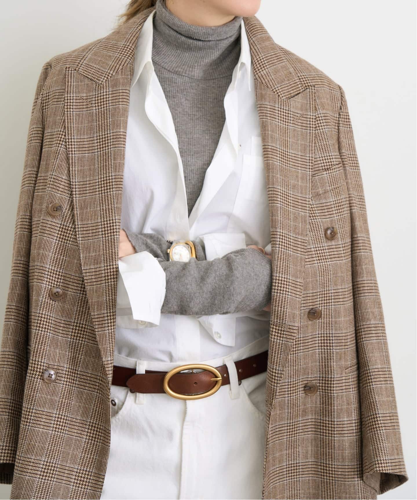 クラシックなチェック柄を軽やかに仕立てたダブルジャケット。ほんのりオーバーサイズなシルエットが抜け感を生み、羽織るだけでこなれた印象に。