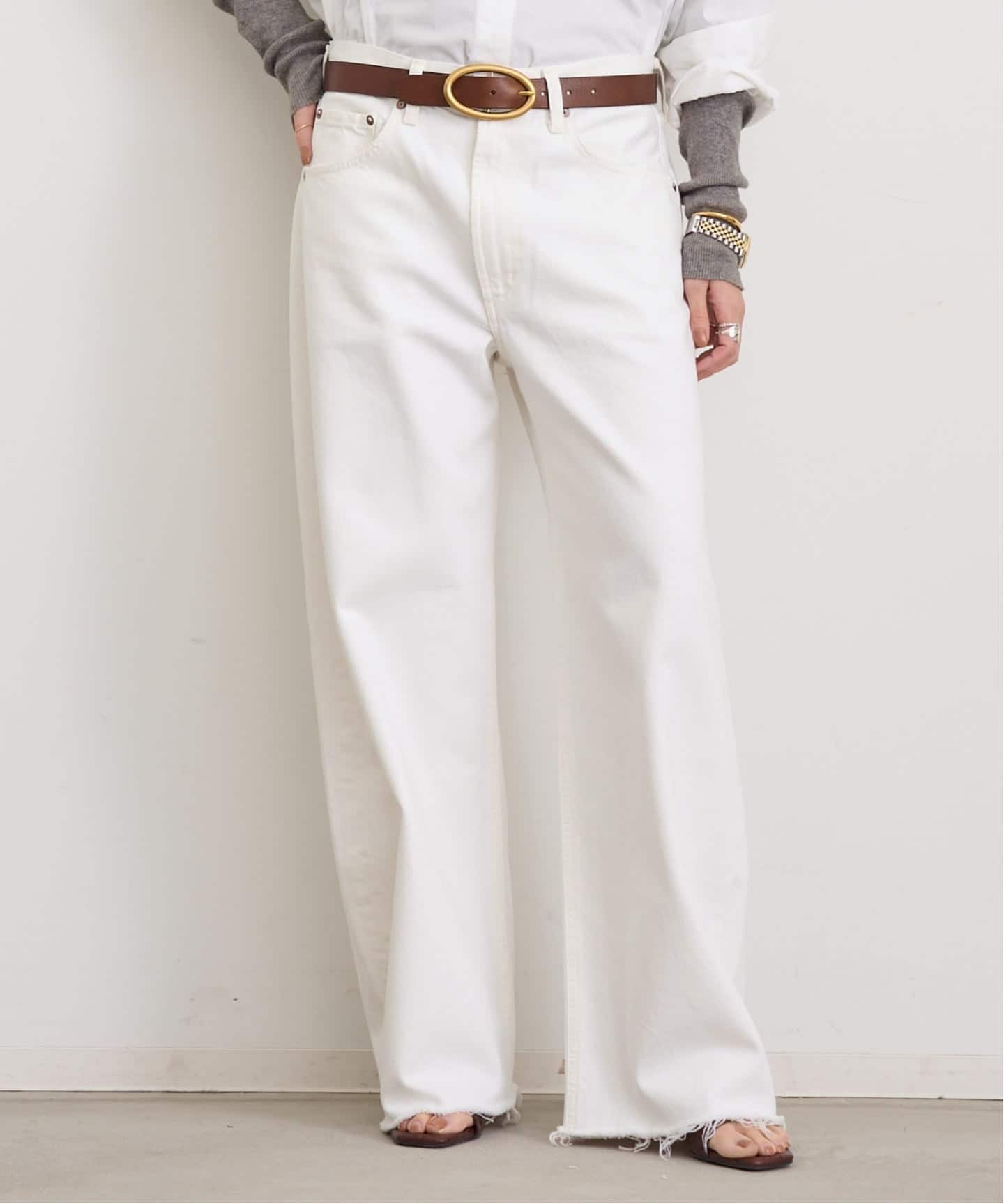 脚をすっきりと見せてくれるシルエットで裾のカットオフが抜け感をプラスしてくれます。