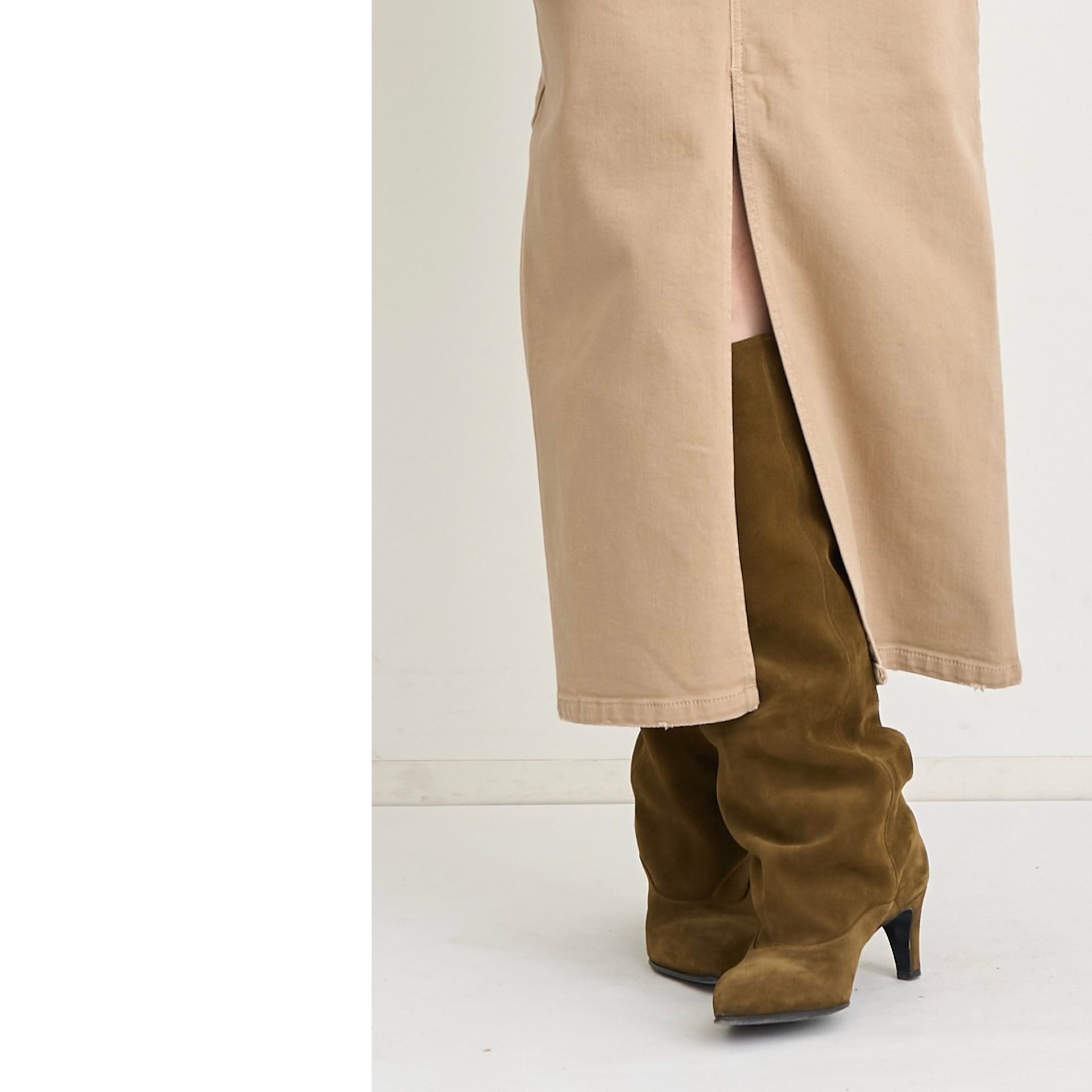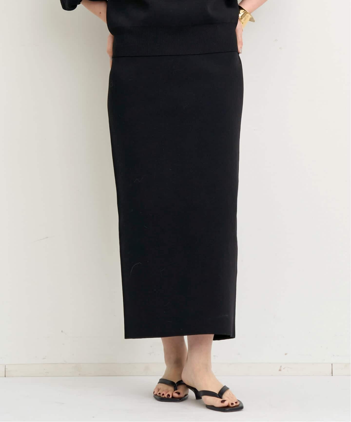 フロントスリットが女性らしい抜け感を生み、縦ラインが強調されることですっきりと見えます。程よく肌がのぞくことで、重たくなりがちなタイトスカートも軽い印象に。