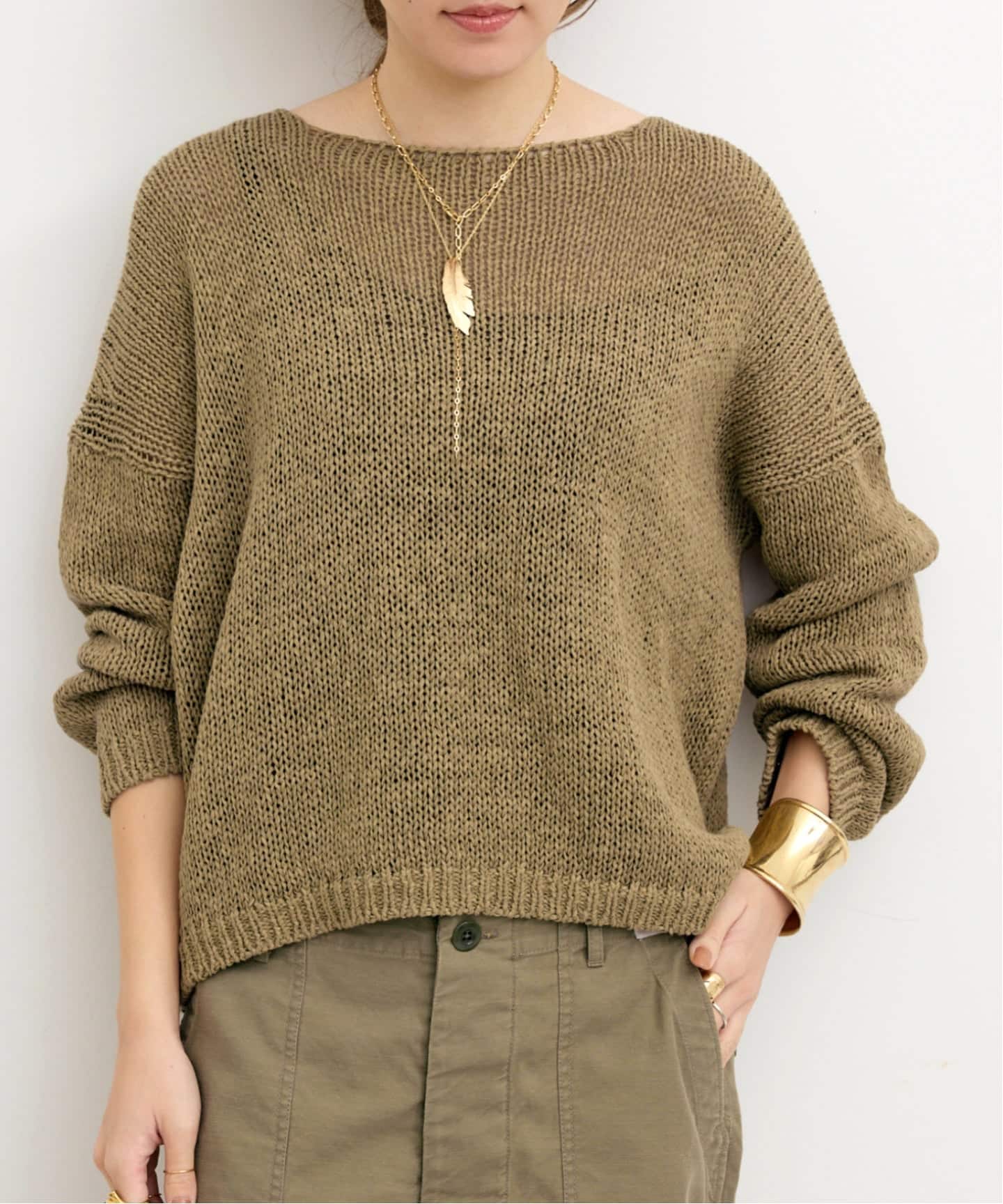 ざっくりとした編み目とボートネックが女性らしさを引き立てるニット。カーキベージュの色味が柔らかな雰囲気に。