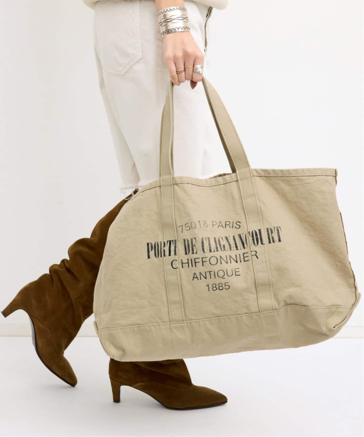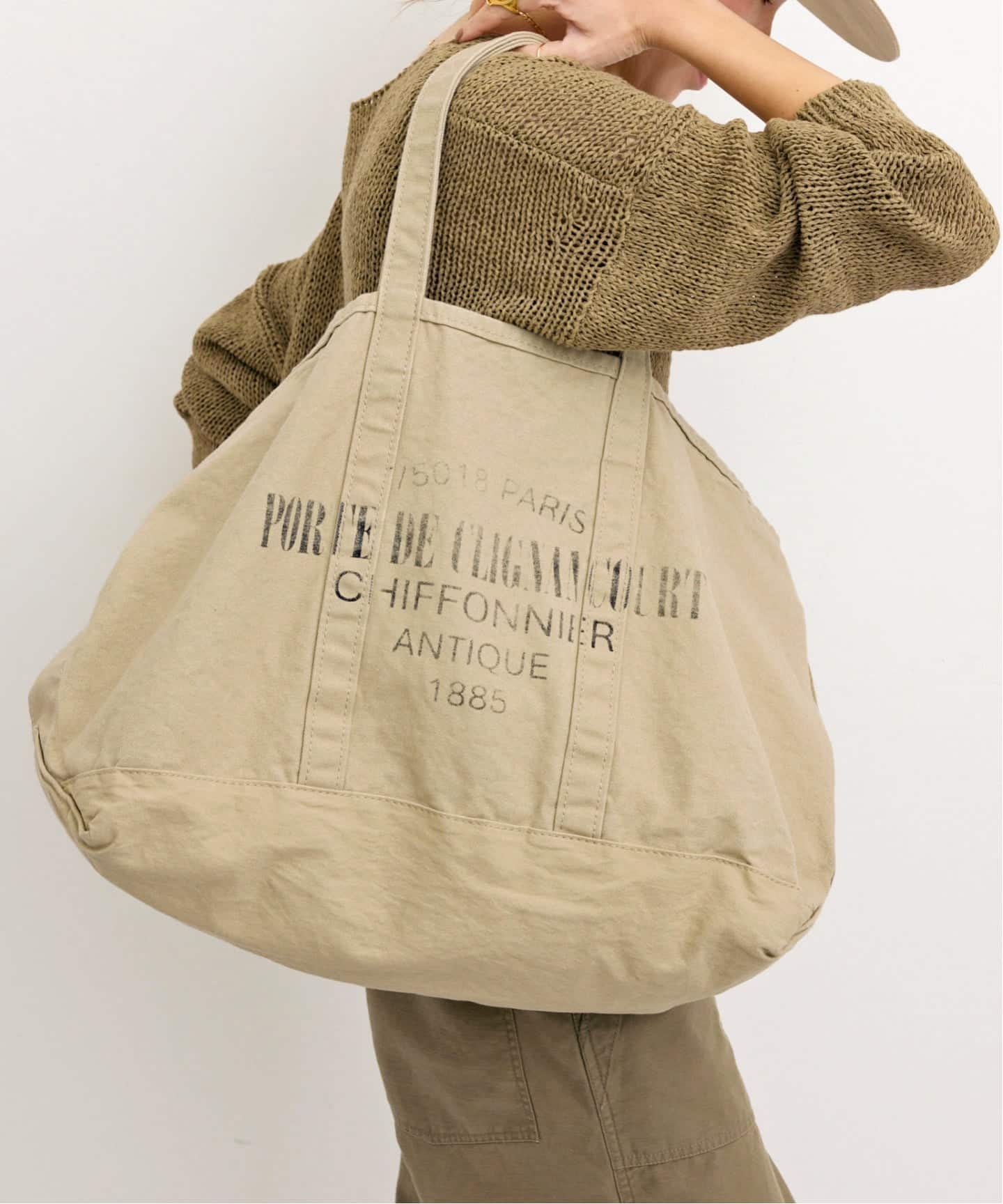 パリのヴィンテージマーケットをイメージしたグラフィックが目を惹く別注トートバッグ。表裏で異なるプリントをあしらい、スタイリングのアクセントとしても映えるデザインに仕上げました。