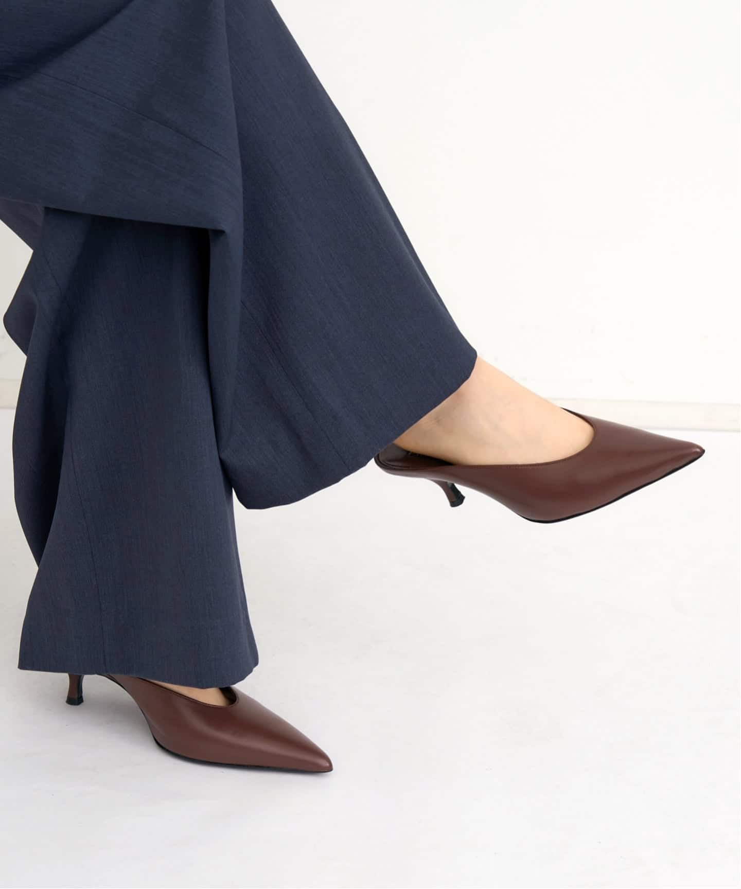 スリップオンデザインで履きやすく、流れるようなフォルムとポインテッドトゥがエレガントな足元を演出します。