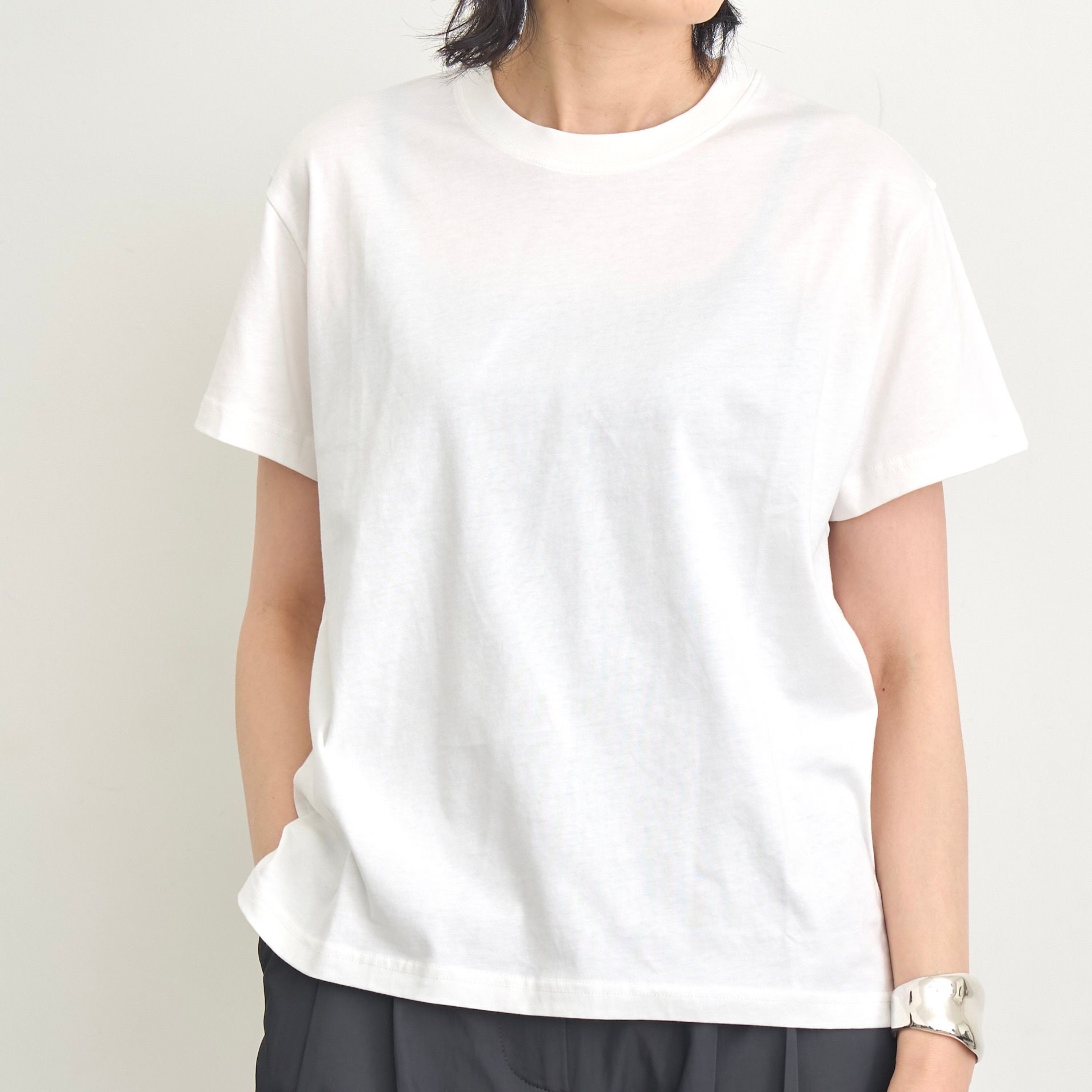 無駄を削ぎ落したミニマルなTシャツ。薄手ながら密な生地はフラットな表情で滑らか、ほど良い張り感と光沢感もあり上品な印象に。