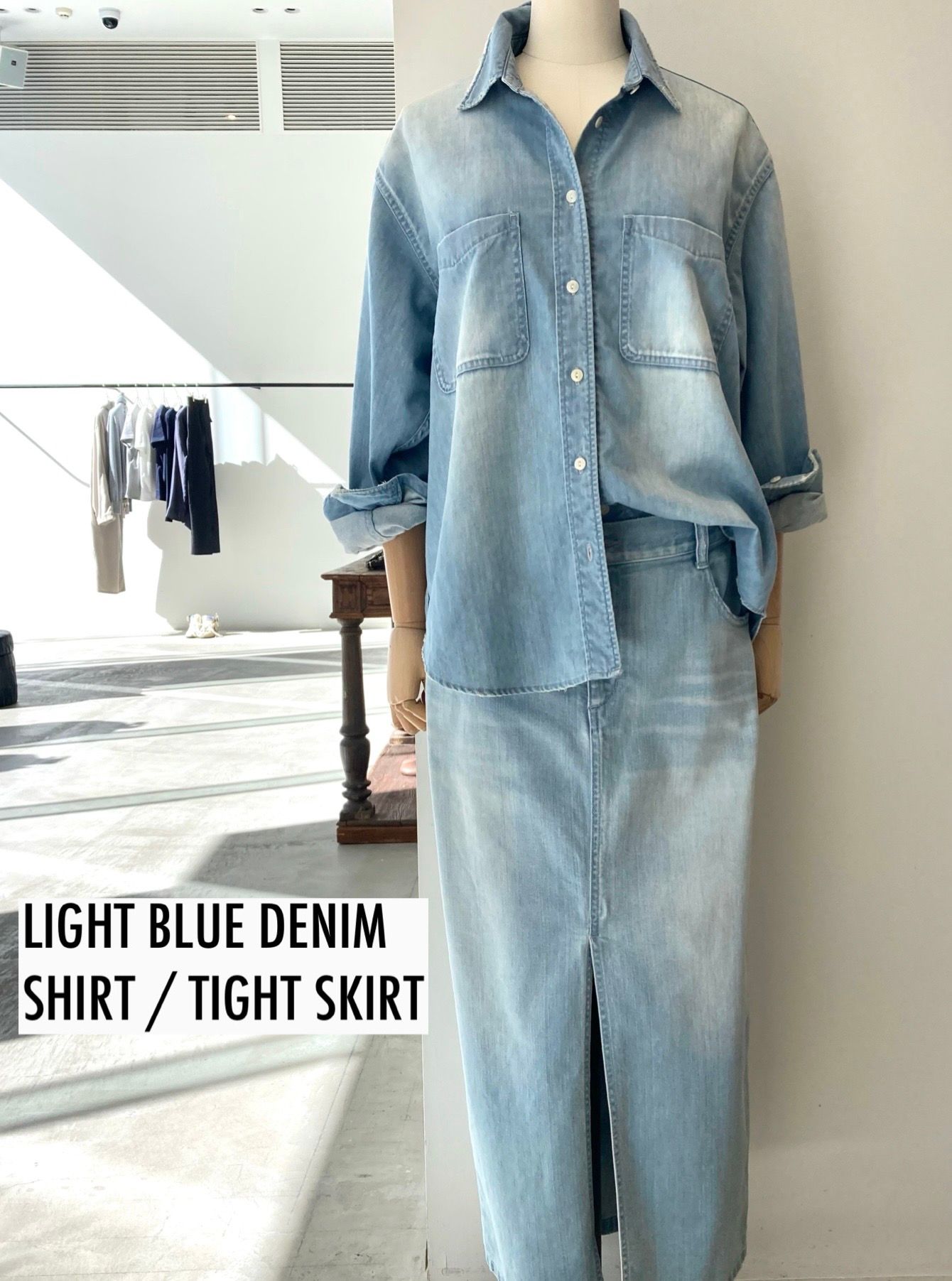 ライトなインディゴデニムで仕立てたシャツとスカートのセットアップ。柔らかな風合いと程よい加工感で、カジュアルながらも上品に着こなせます。
