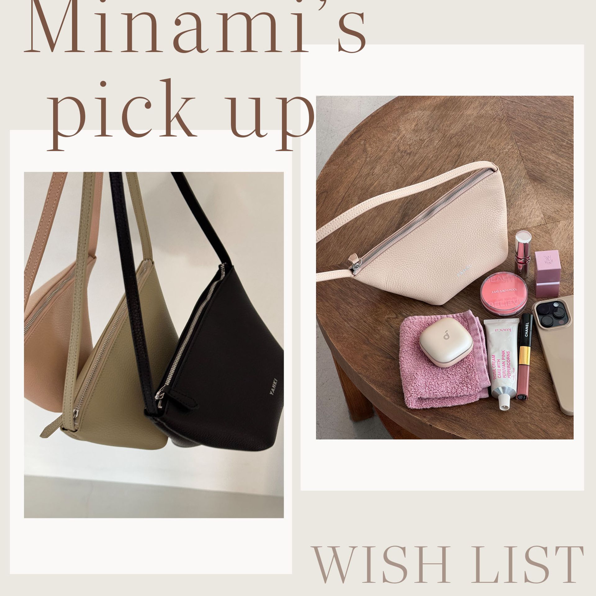 リアルな私物はベージュ&ピンクが多いですね。全てYAHKIのバッグに収納できます。
