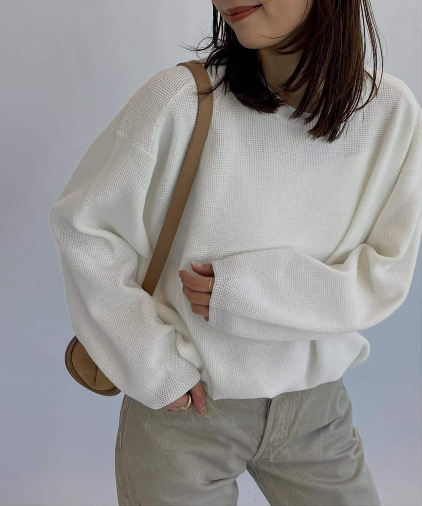 ホワイトの足元で軽やかな春スタイリング。質感やサイズ感にこだわった上品できれいめな合わせに、メッシュの抜け感が程よく柔らかい印象に見せてくれます。