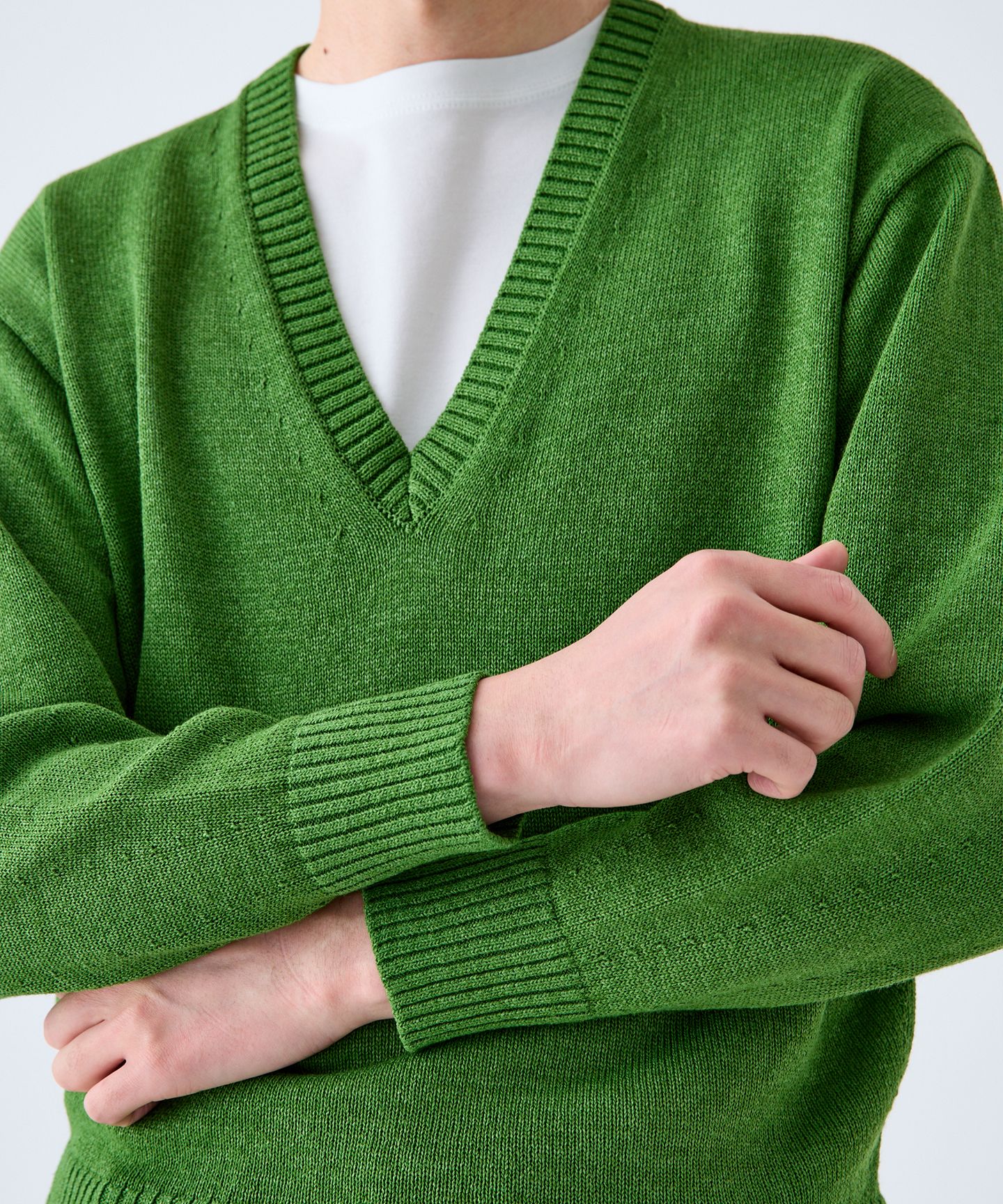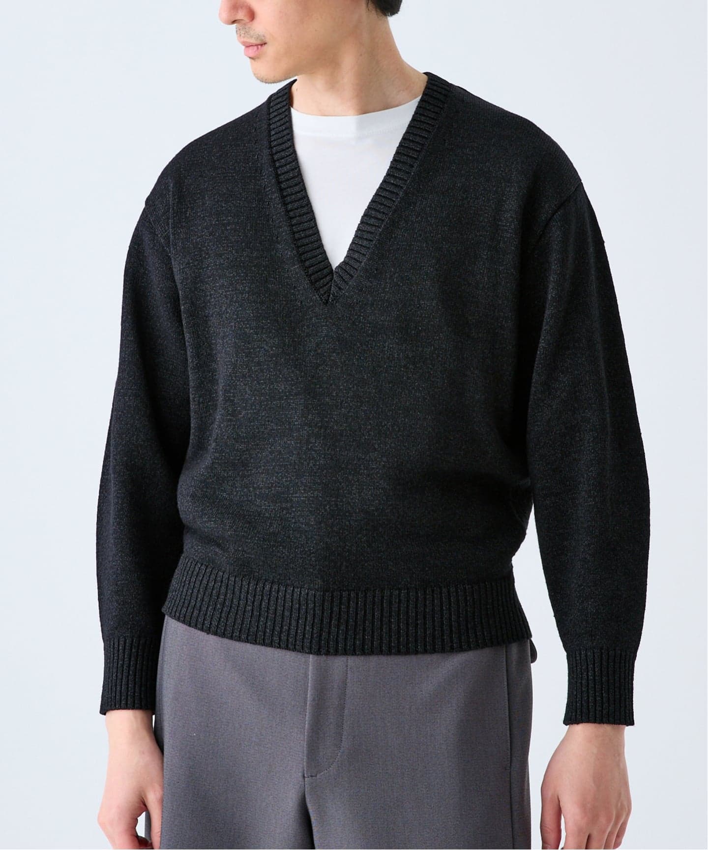 ウールと和紙を組み合わせたサマーウールならではの軽やかな着心地が魅力の深Vネックニット。梳毛ウールの上質さに、和紙のドライなタッチとハリ感をプラスし、同色でも奥行きのある微妙な色差を生み出しています。深めのVネックは、カットソーやシャツとのレイヤードを美しく見せるデザイン。着丈短め、バルーンスリーブの丸みあるシルエットで、ワイドスラックスとの相性も抜群です。