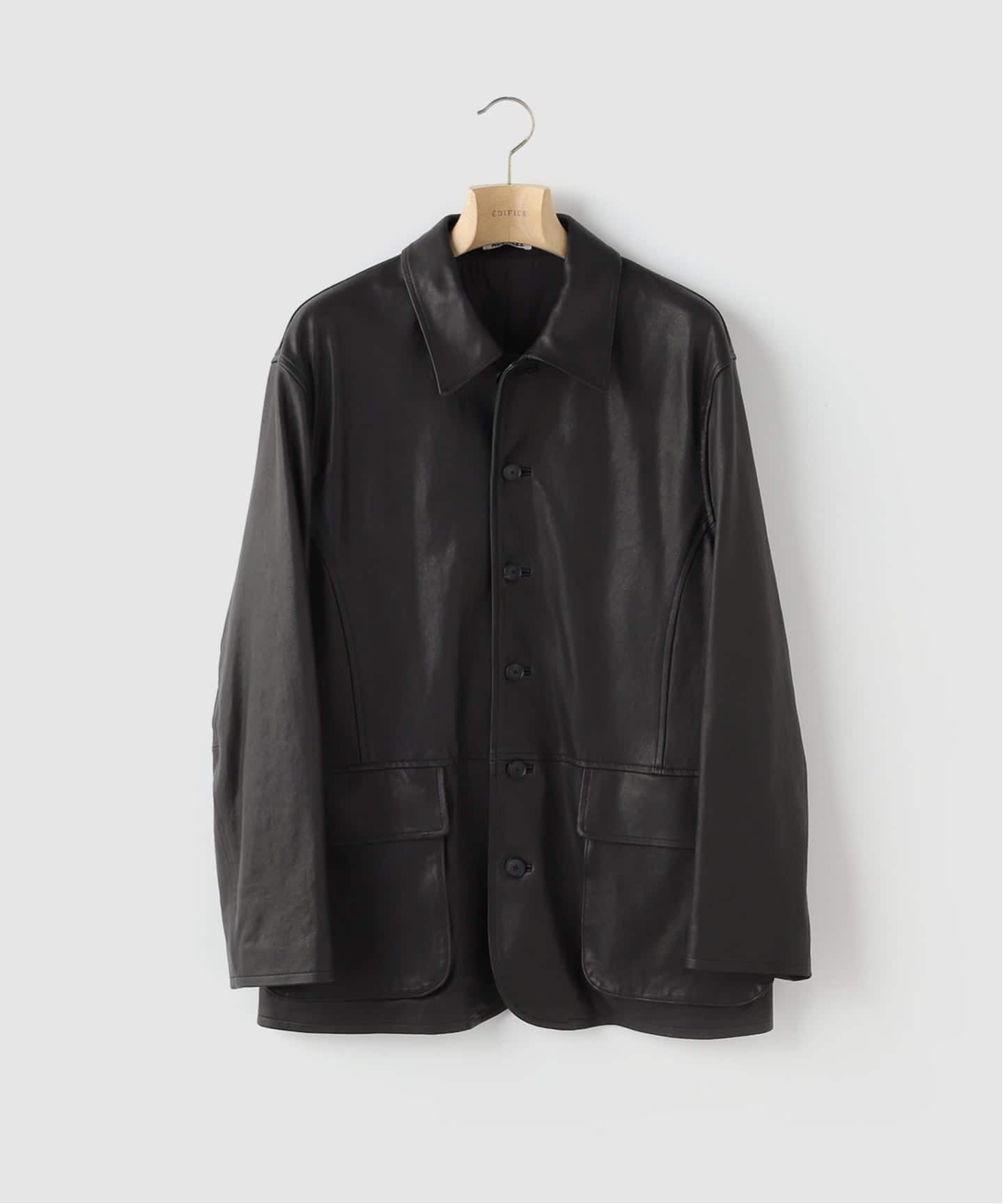 シボ感を抑えたクリーンな表革が、レザーの無骨さを和らげ、品のある佇まいを演出。ドッグイヤー型の襟がさりげなくトラディショナルなムードを添え、肩周りにゆとりを持たせたリラックスシルエットで快適な着心地に。