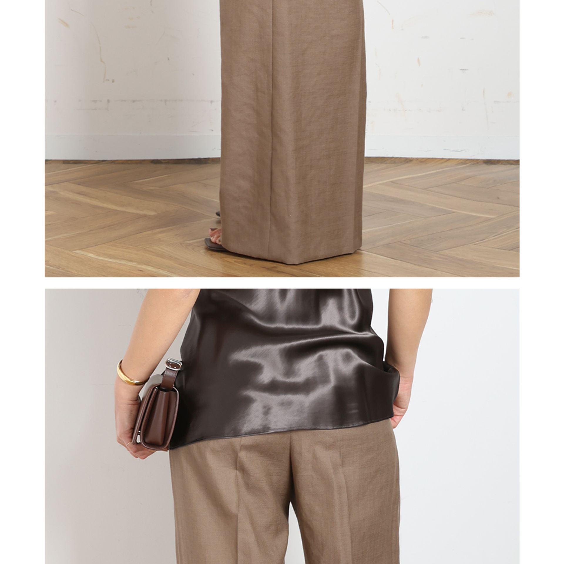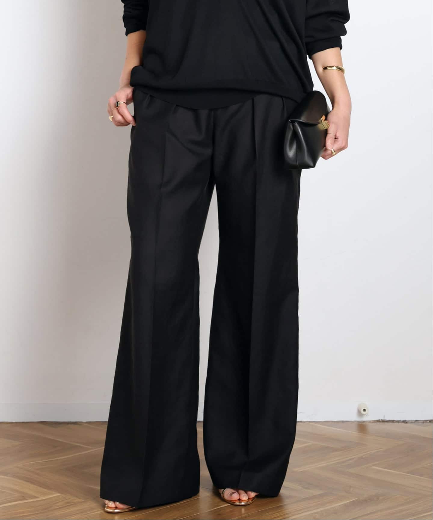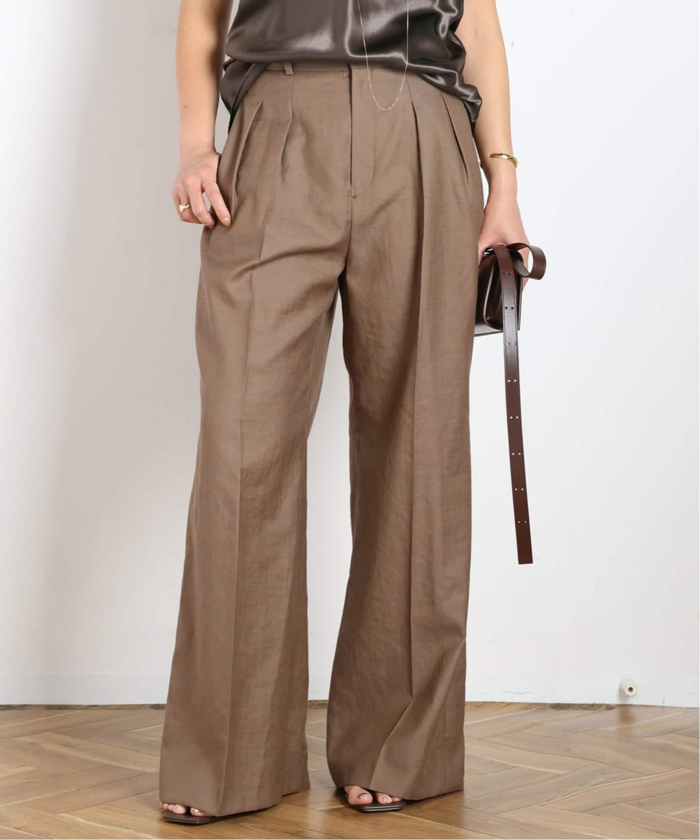 素材を活かした立体的な2タック仕様で脚のラインを拾いづらく、気になる腰周りをスッキリ見せてくれるサイジング。