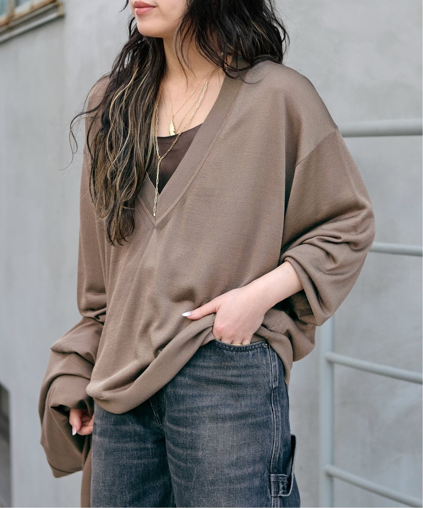デコルテが覗くVネックラインがタフなデニムにもバランスよく決まります。