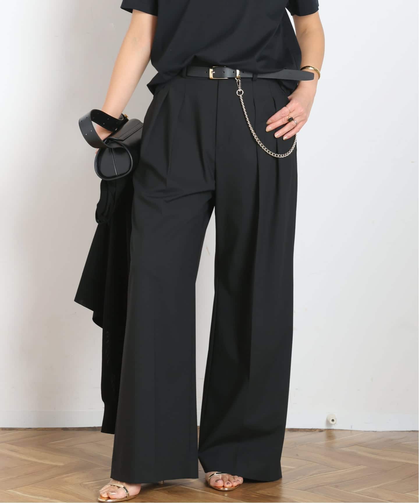 デミュアーシリーズのニットとヴィアトーレハイウエステッドワイドパンツで品よく仕上げました。