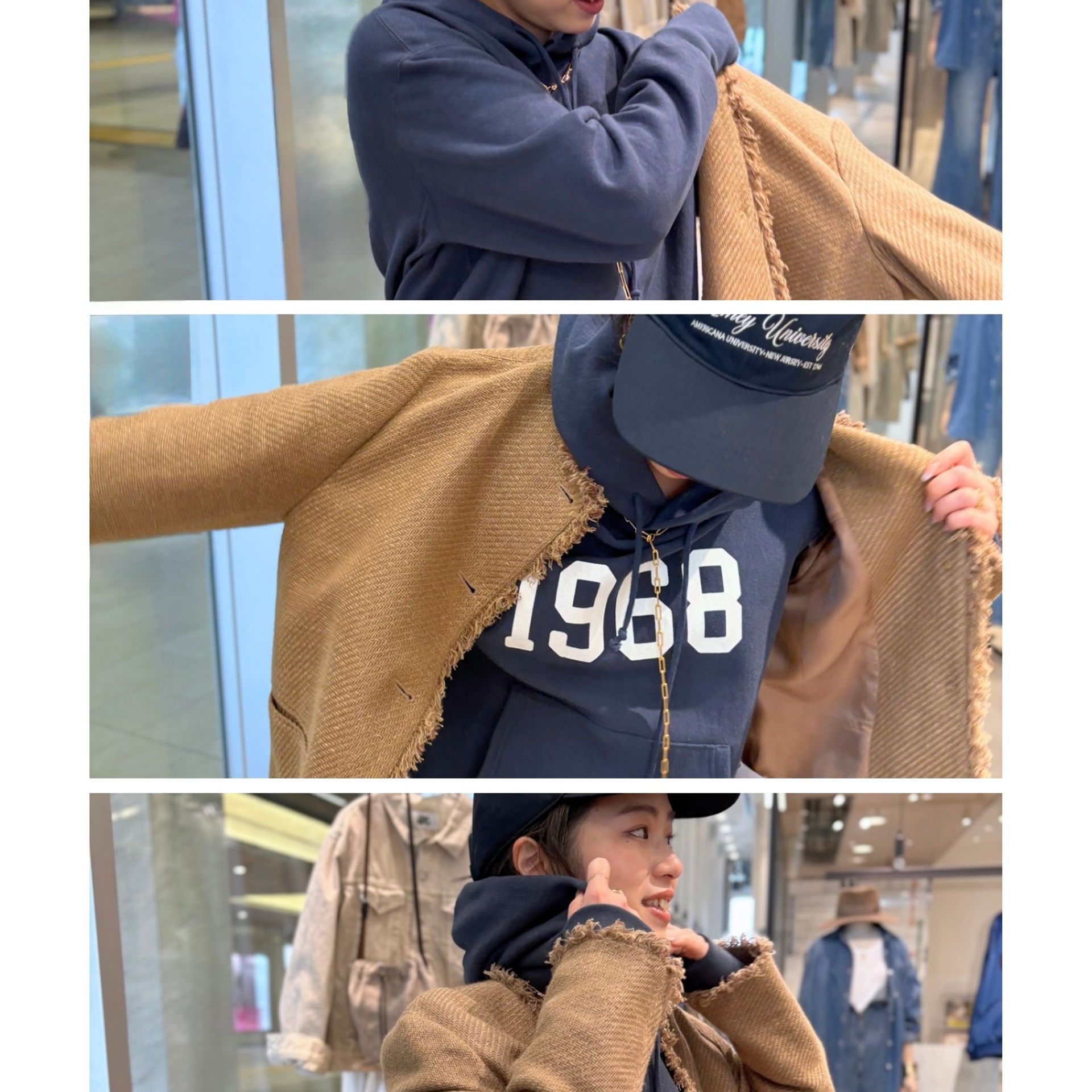 昨シーズンから引き続きトレンドの金ボタンジャケットは、スポーティーなAMERICANAのフーディーを合わせて今のムードに。