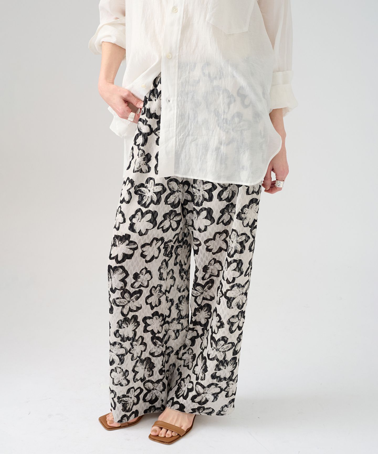 インクで描いたようなフラワーモチーフが、白と黒のコントラストの中で鮮やかに映える Shadow Bloom パンツ。