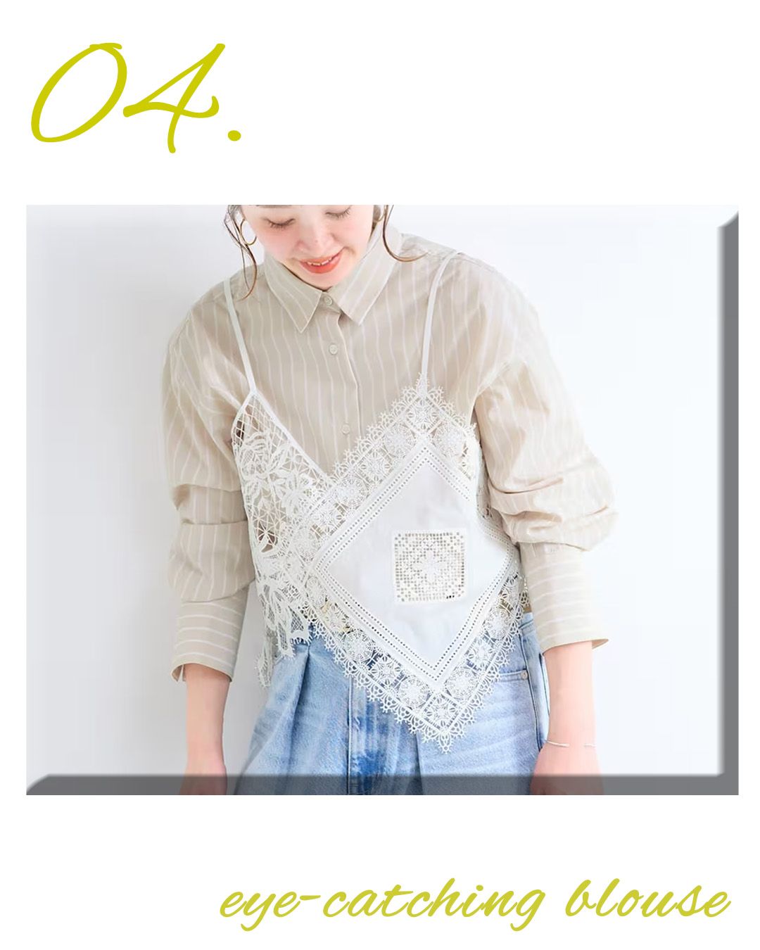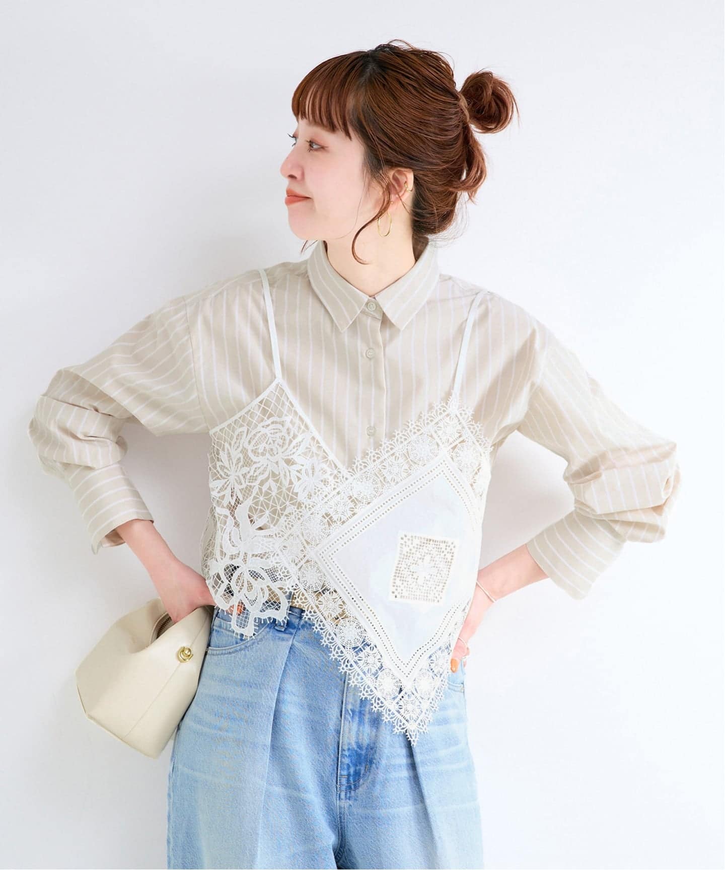 キャミソールは、モチーフレースとハンカチレースを組み合わせたアシンメトリーデザインでコーディネートにさりげない個性をプラス。後ろのリボン&肩紐は長さ調整が可能なため、インナーや体型に合わせてフィット感を調整できます。シャツは、ベーシックな襟付きに細めのストライプ柄を採用。きちんと感がありながらも軽やかな印象で、レースキャミの甘さを程よく引き締めます。レイヤードはもちろん、シャツ単体でも着回ししやすい万能アイテムです。