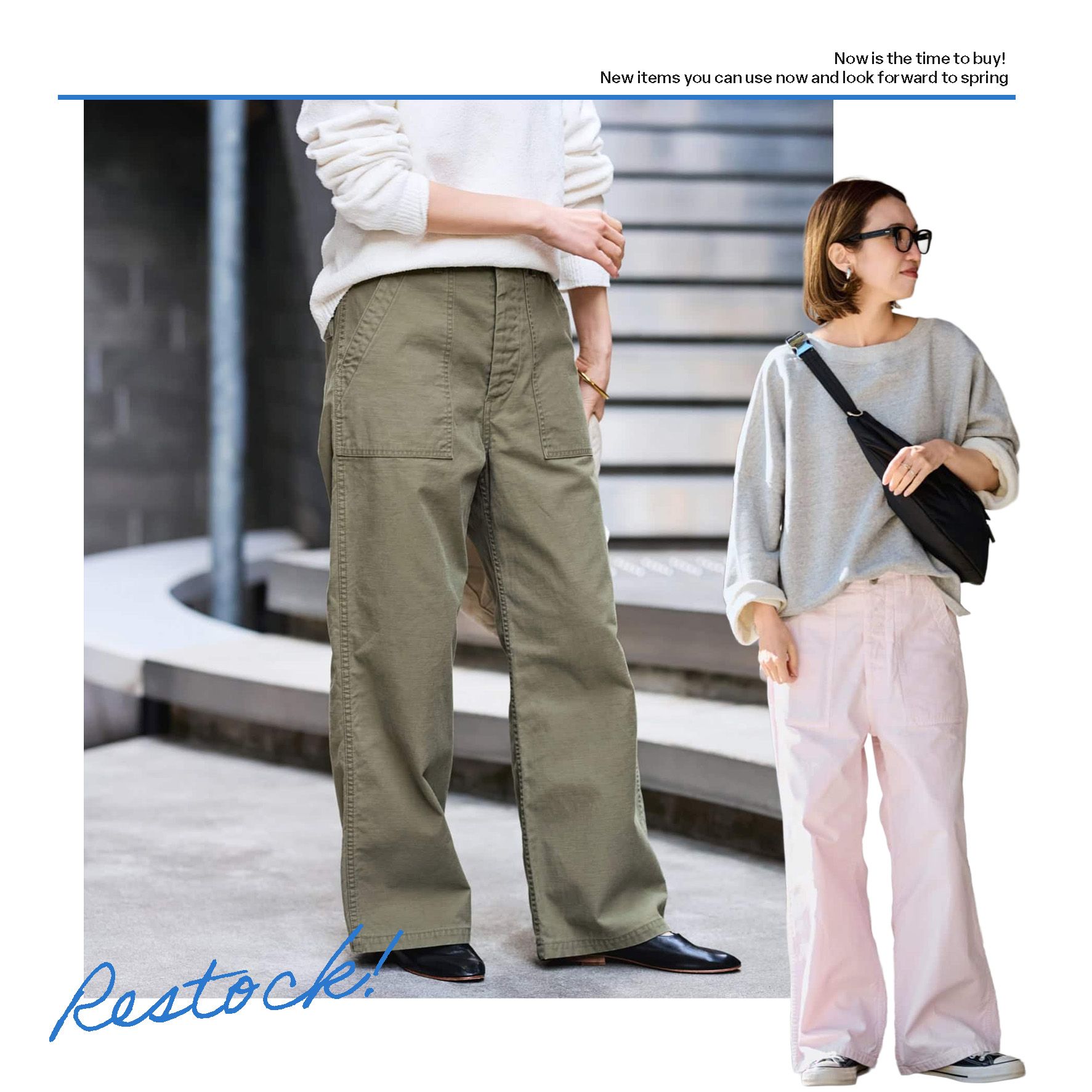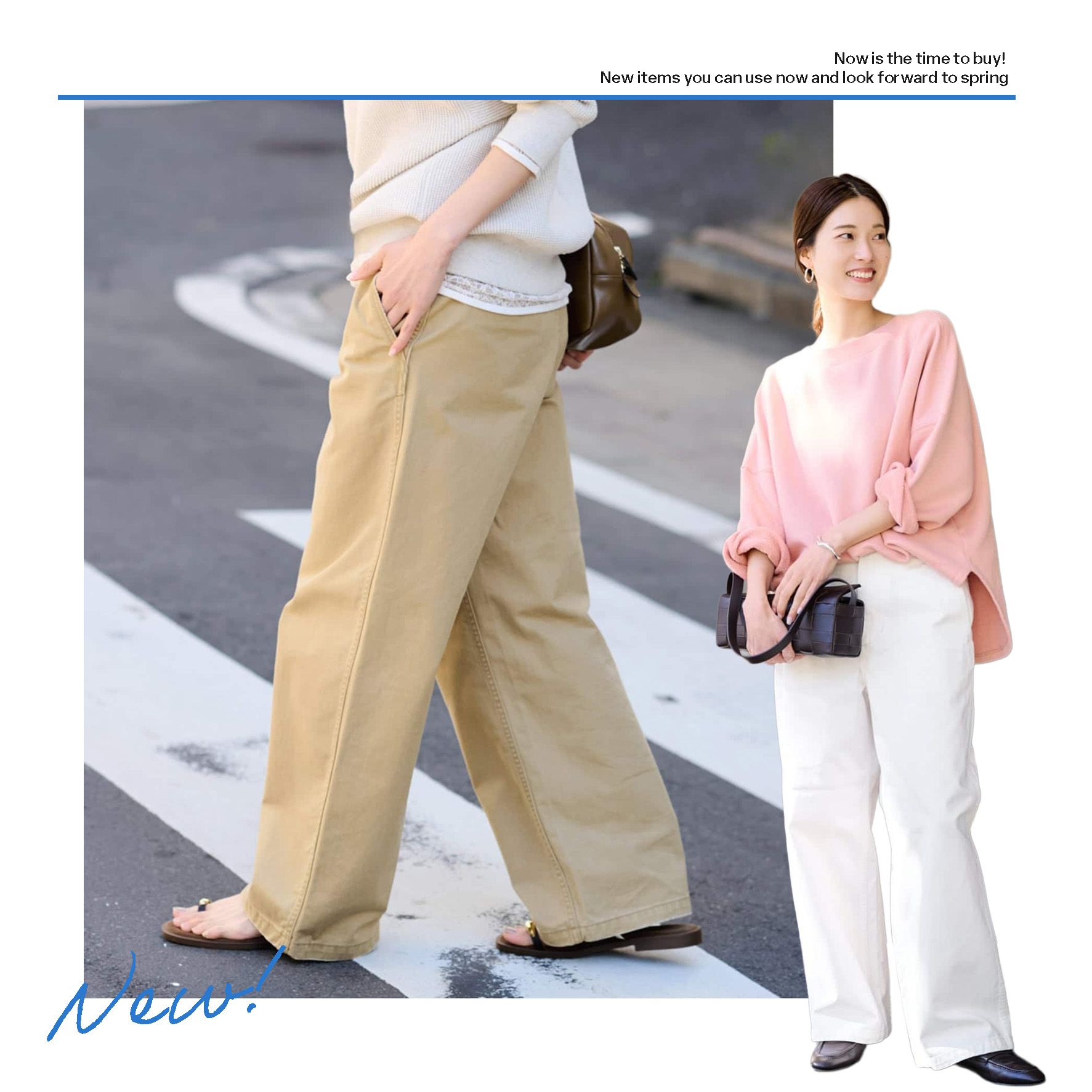 春といえばのチノパンツと、コーデを軽やかにみせてくれるフレアスカートが新登場です。