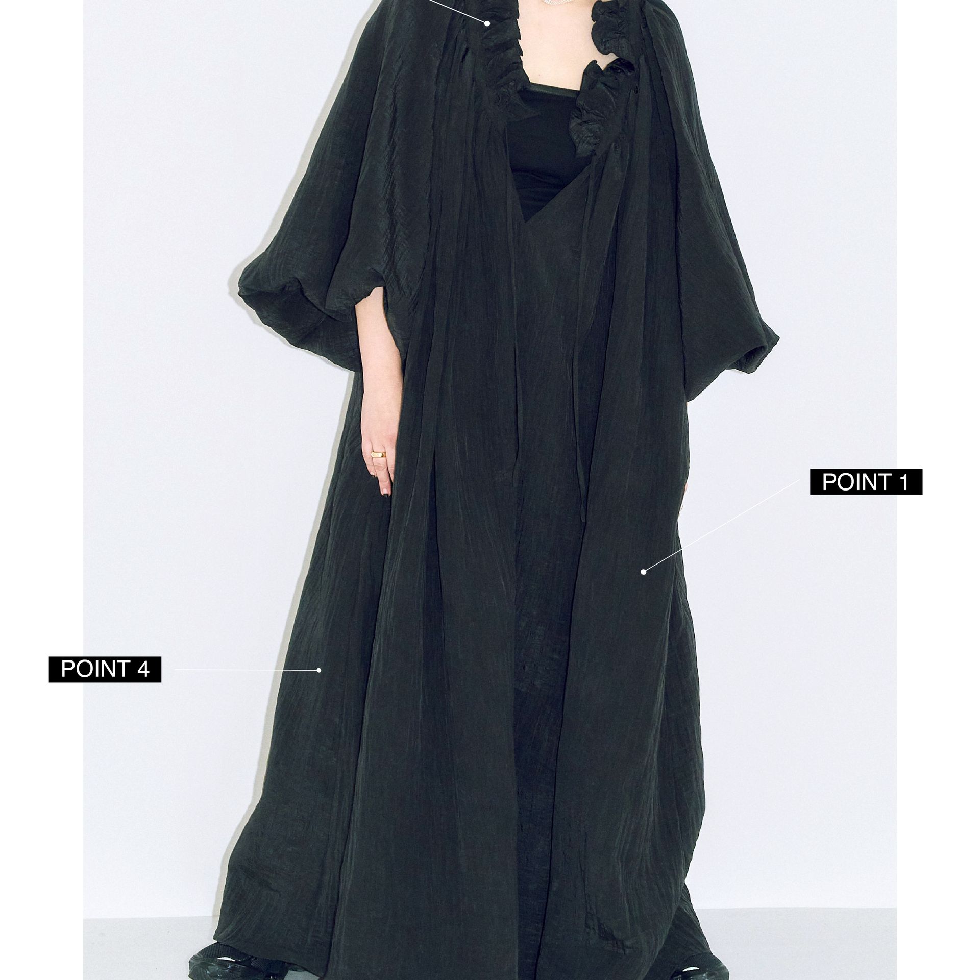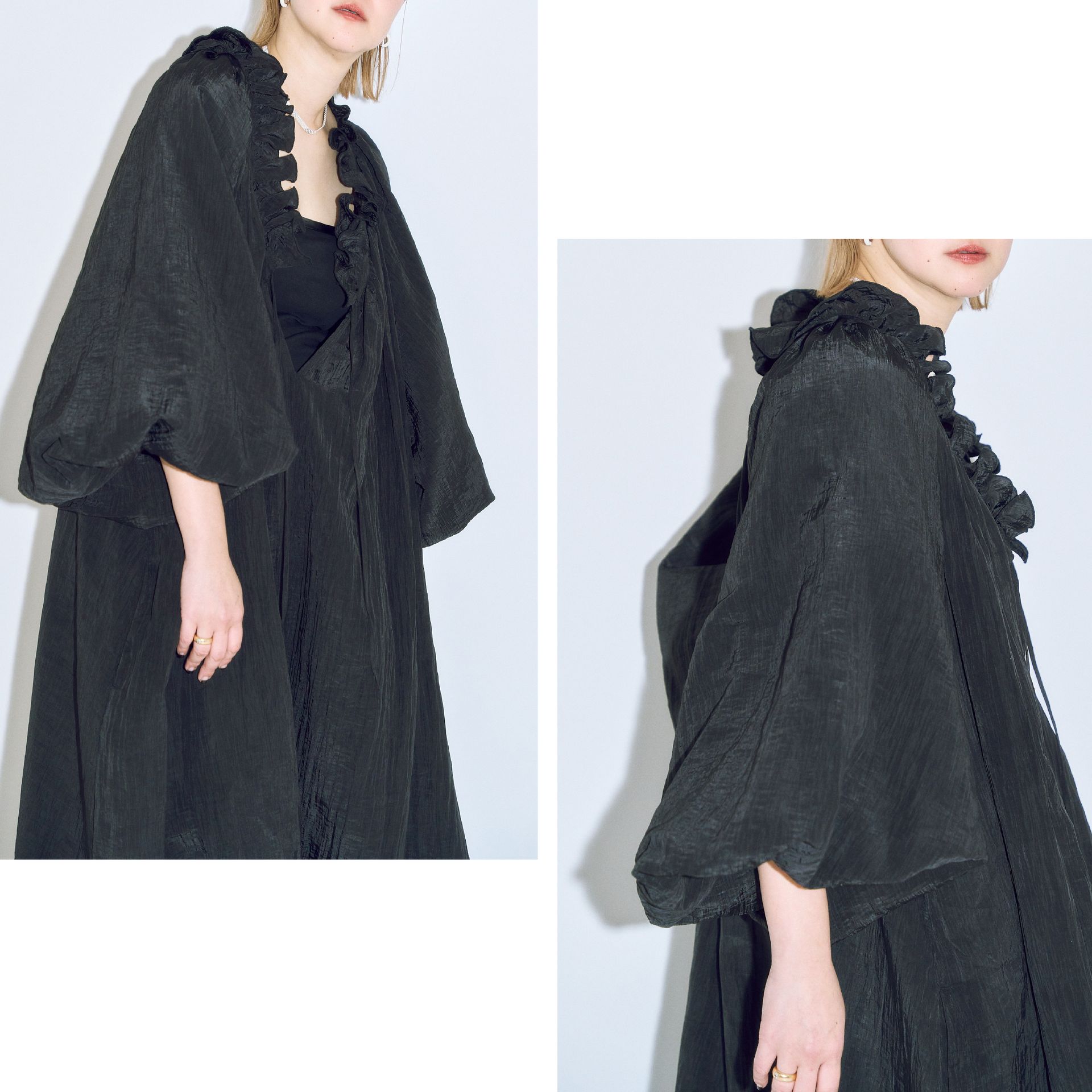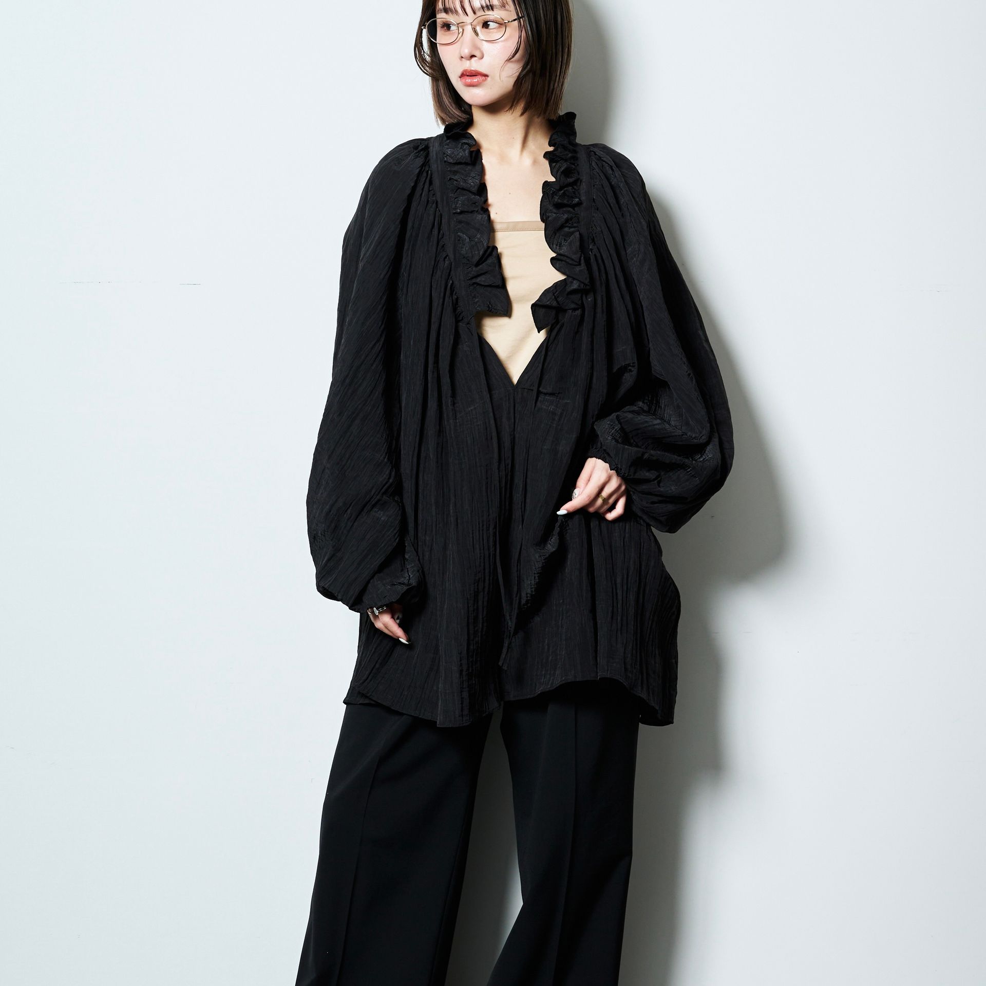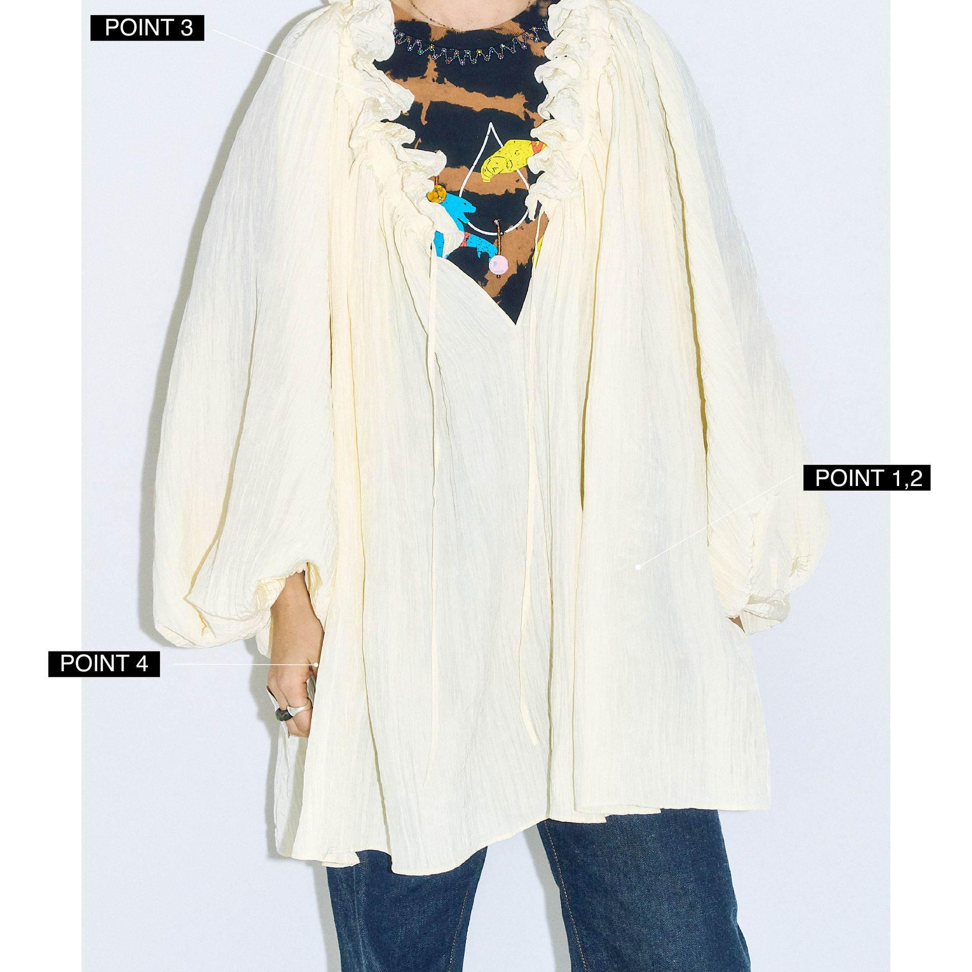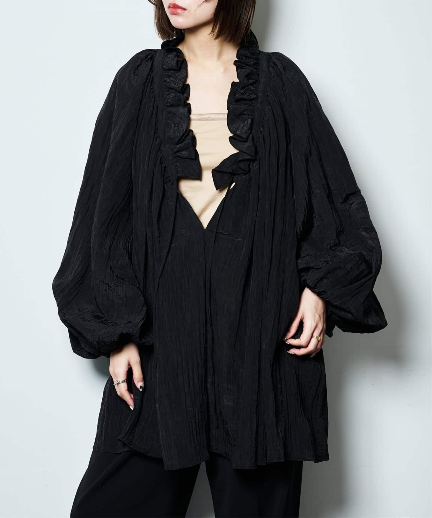 ワッシャー加工の表情はそのままに、たっぷりとした襟フリルとオーバーサイズのバランスで、甘さを抑えたモードな一着に仕上げました。