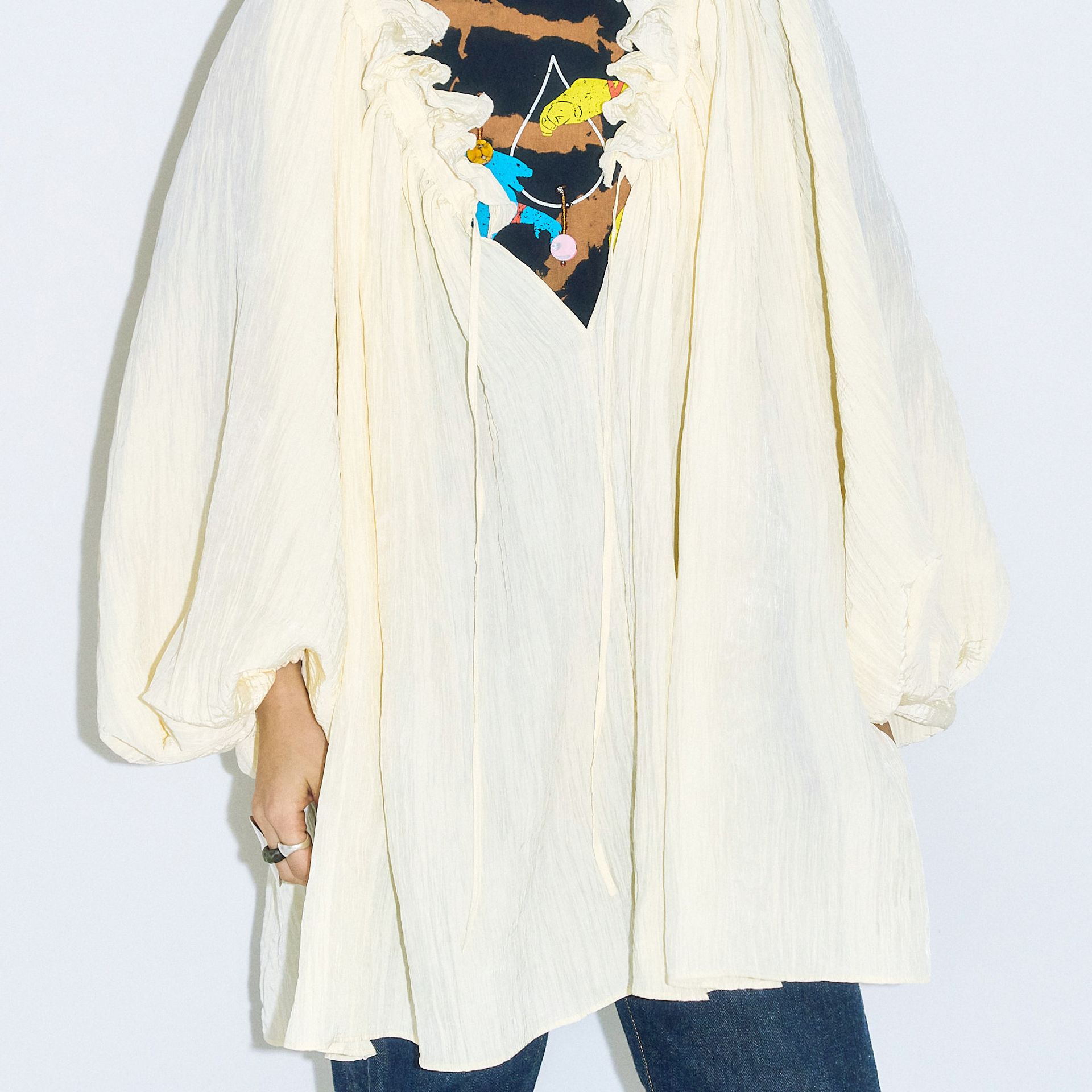 SHAKASHAKA DRESSの世界観を、よりデイリーに楽しめるチュニック丈ブラウス。