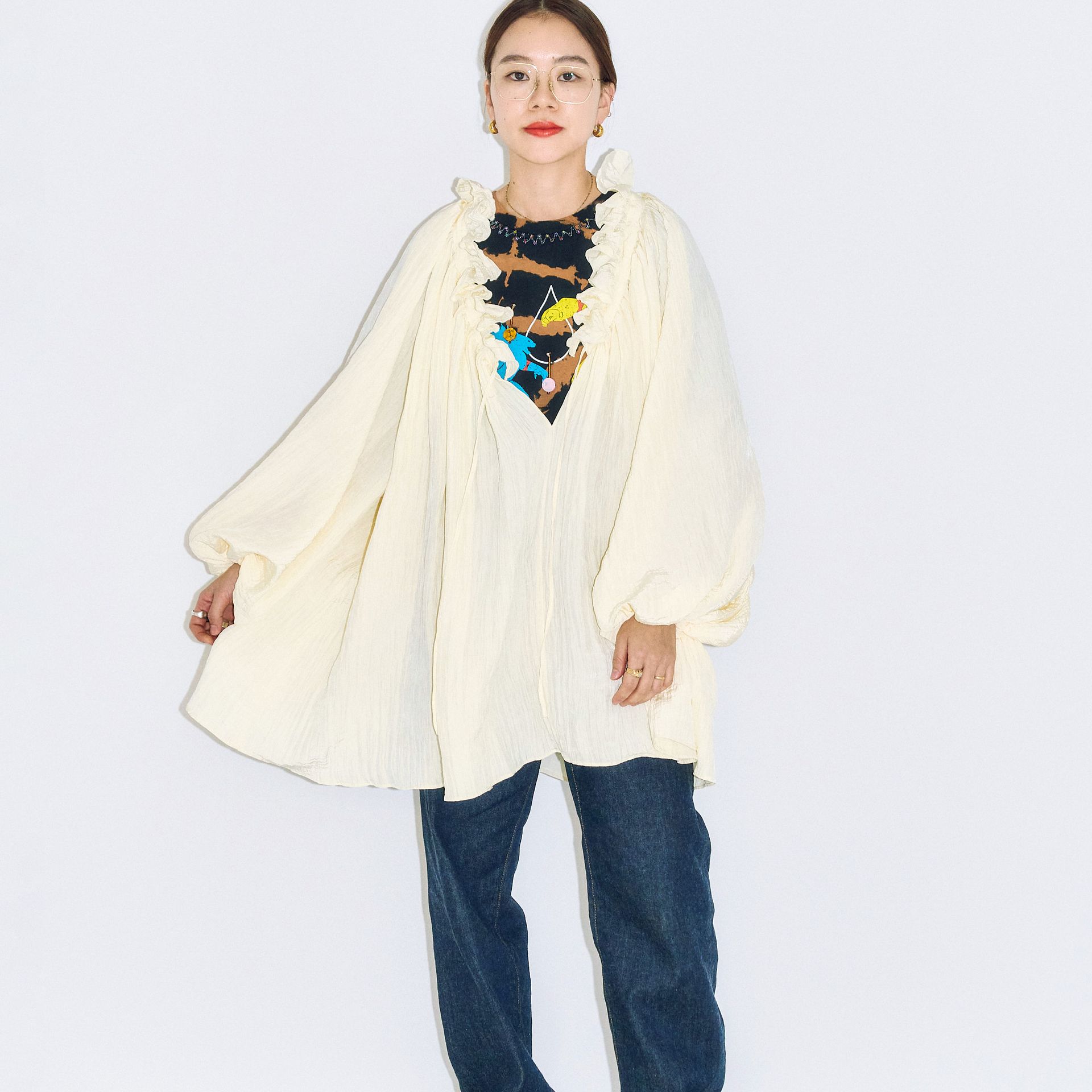ワッシャー加工の軽やかな素材感に、たっぷりとしたフリル襟とオーバーサイズのバランス。甘さを抑えたモードな一着に仕上げました。