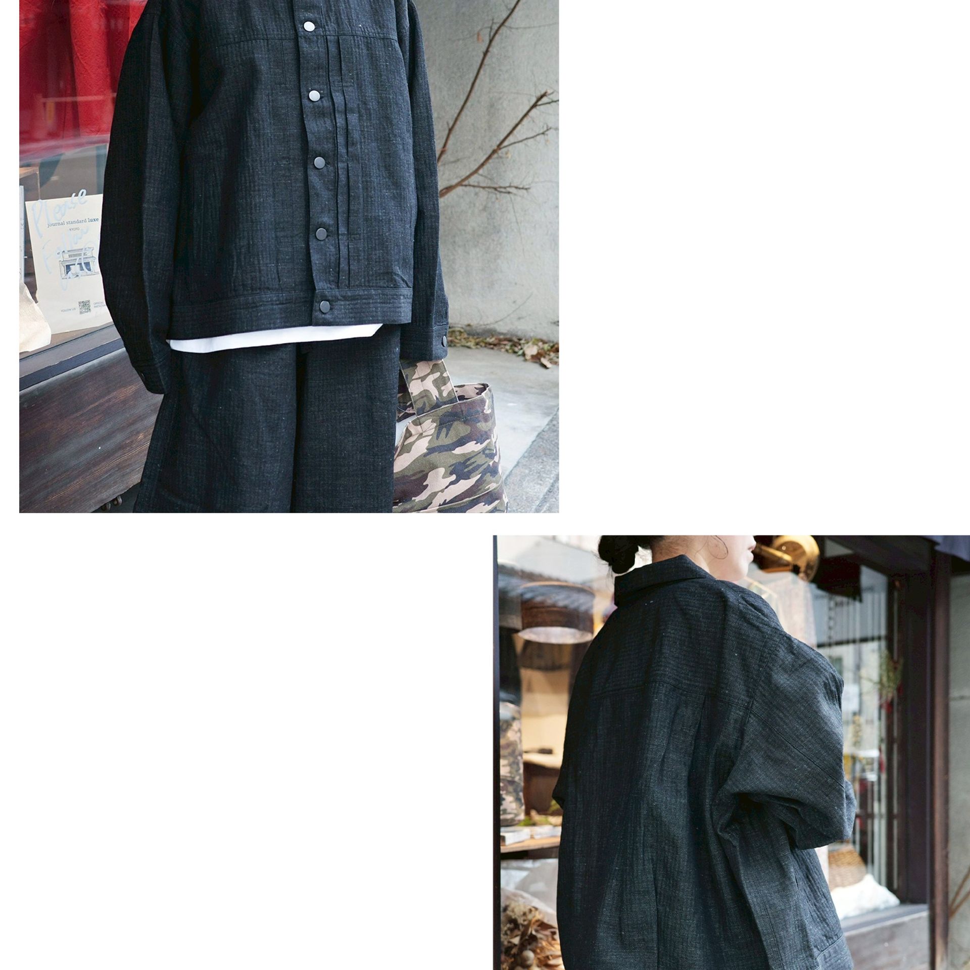 シルエットはゆったりとしたワイドストレート。中に着るものを選ばないよう、アームホールを大きめに作りました。