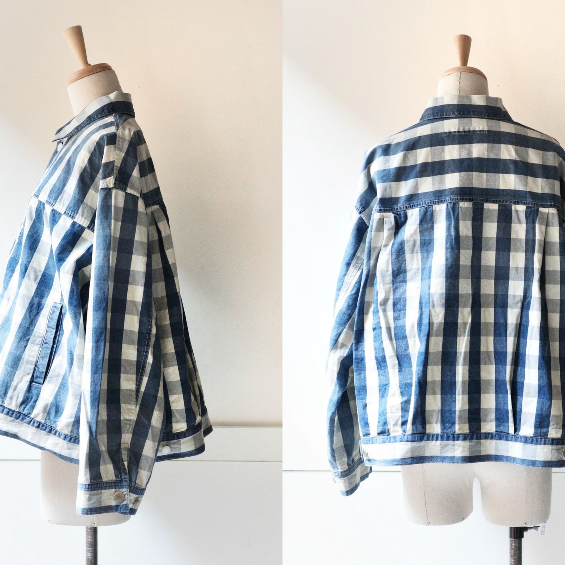 インディゴ糸を使った大きいブロックチェック柄は、加工を入れて色目を馴染ませ、雰囲気よく仕上げました。インディゴ糸を使用しているため、経年変化も楽しめます。