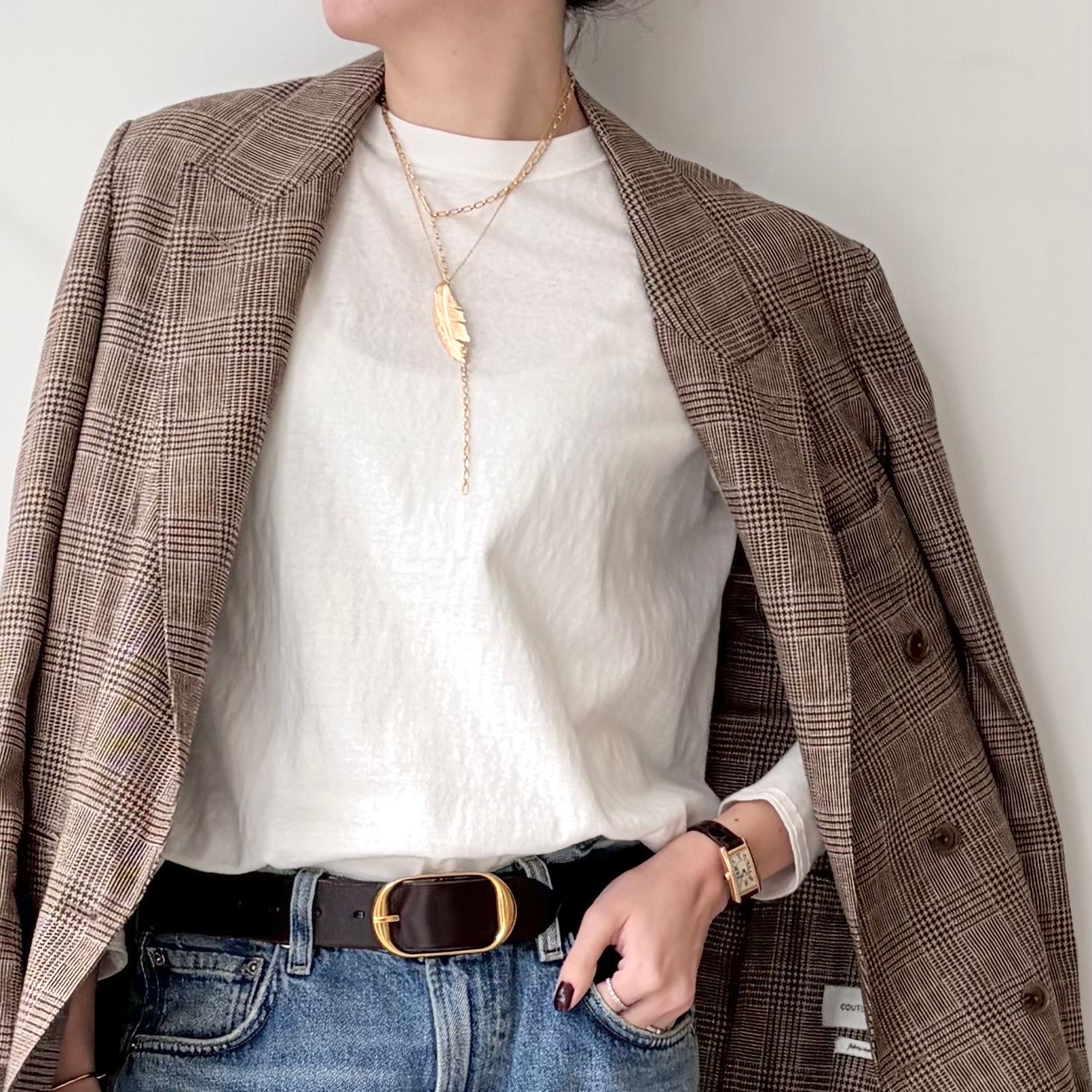 重ねたときにバランス良くのぞく長めの着丈と、インに着た時にもたつかないよう計算されたネックの開きがポイントです。