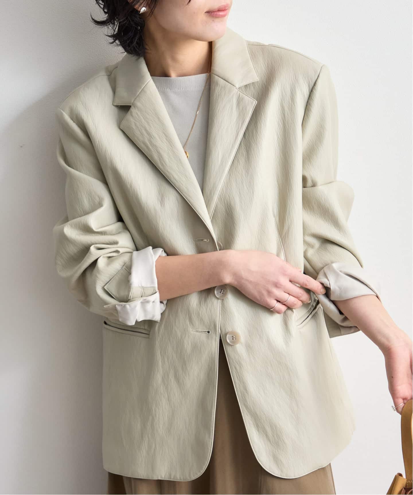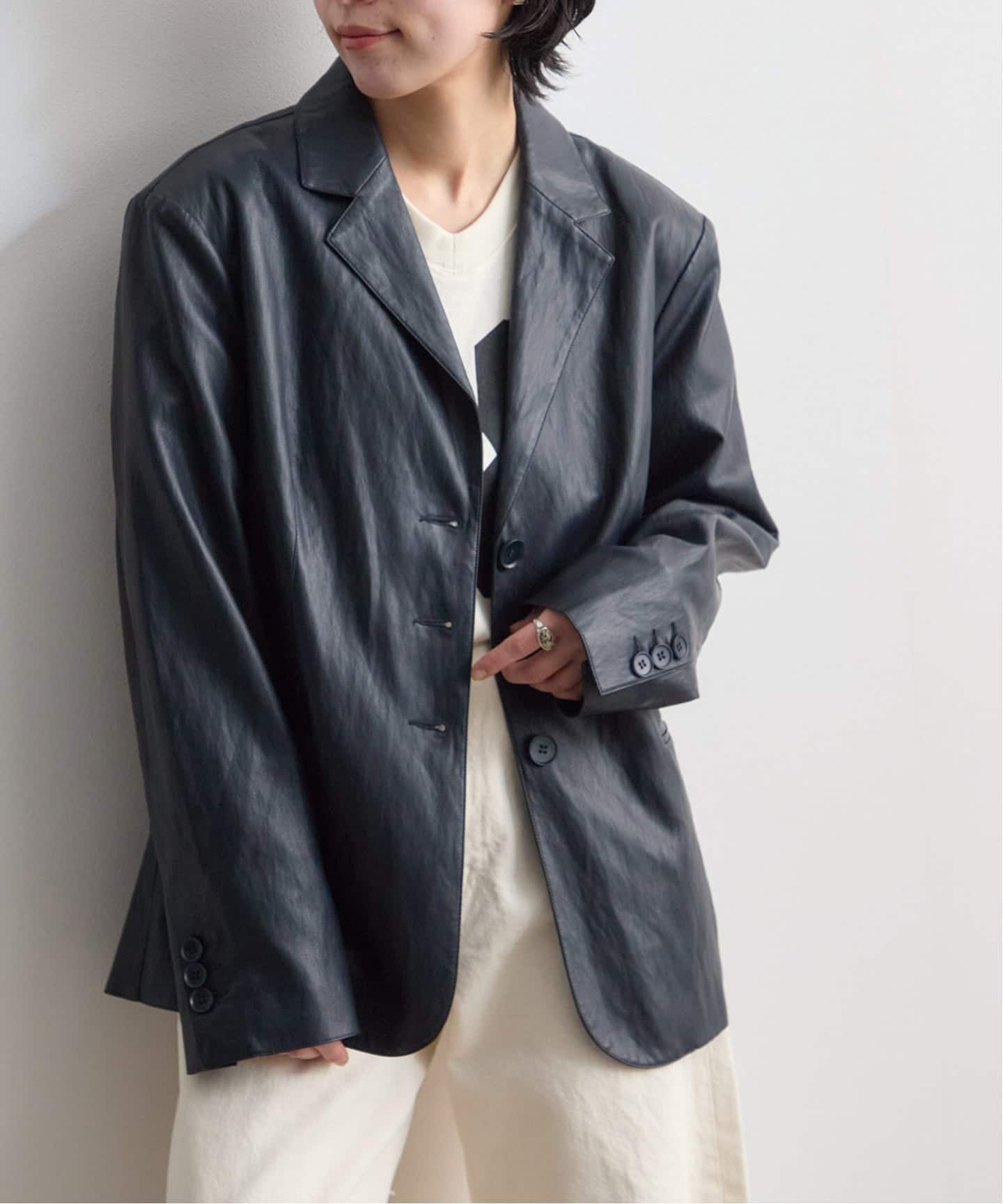 エコレザー素材で仕上げたテーラードジャケット。オーバーなシルエットですが、優しく体に馴染む柔らかな風合いですっきりとした印象で着ていただけます◎