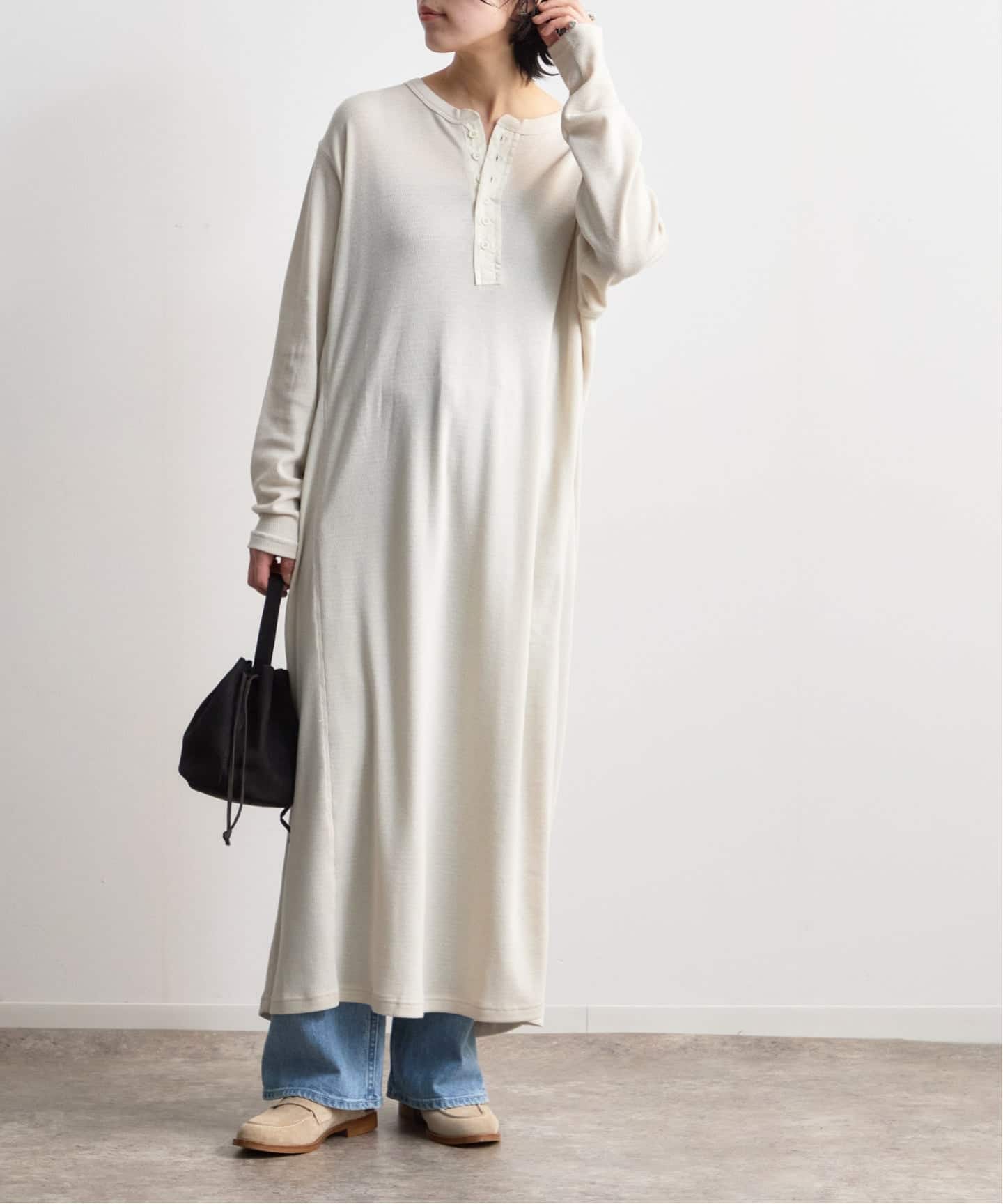 ヘンリーデザインがポイントの柔らかく肌触りの良いサーマル素材を使用したロングワンピース。
