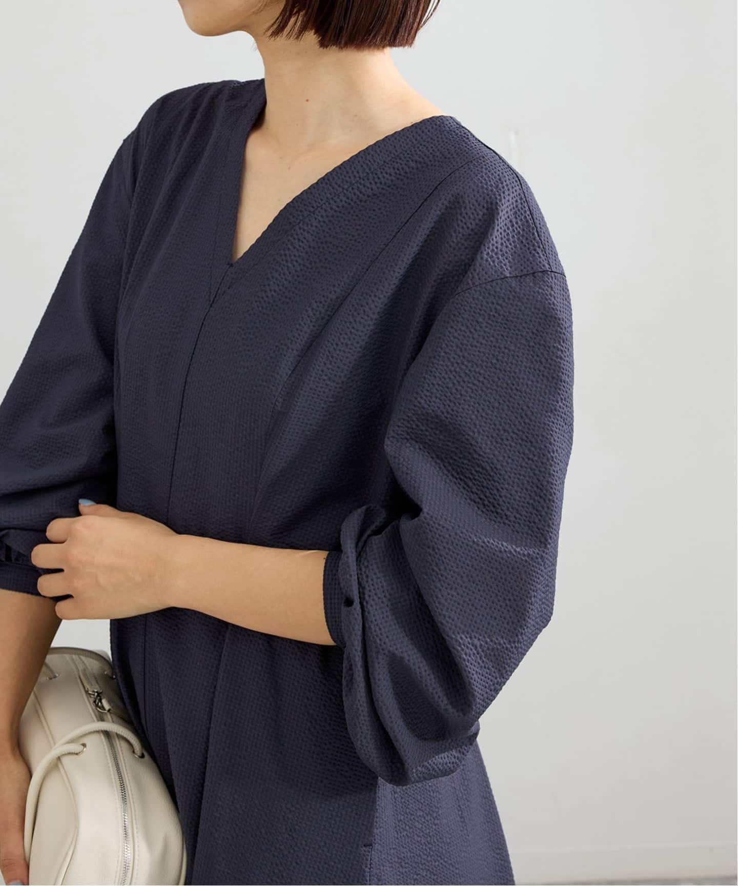 ・モードな着こなしが叶う、ジャケットをベースにしたVネックワンピース。