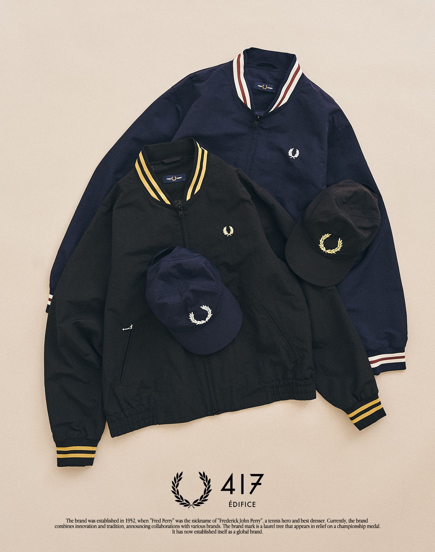 1950年代のテニスジャケットをルーツに。417 ÉDIFICEの視点で街着として再構築した、今季のFRED PERRY別注。シルエットと素材を現代的に整えた特別なコレクションです。