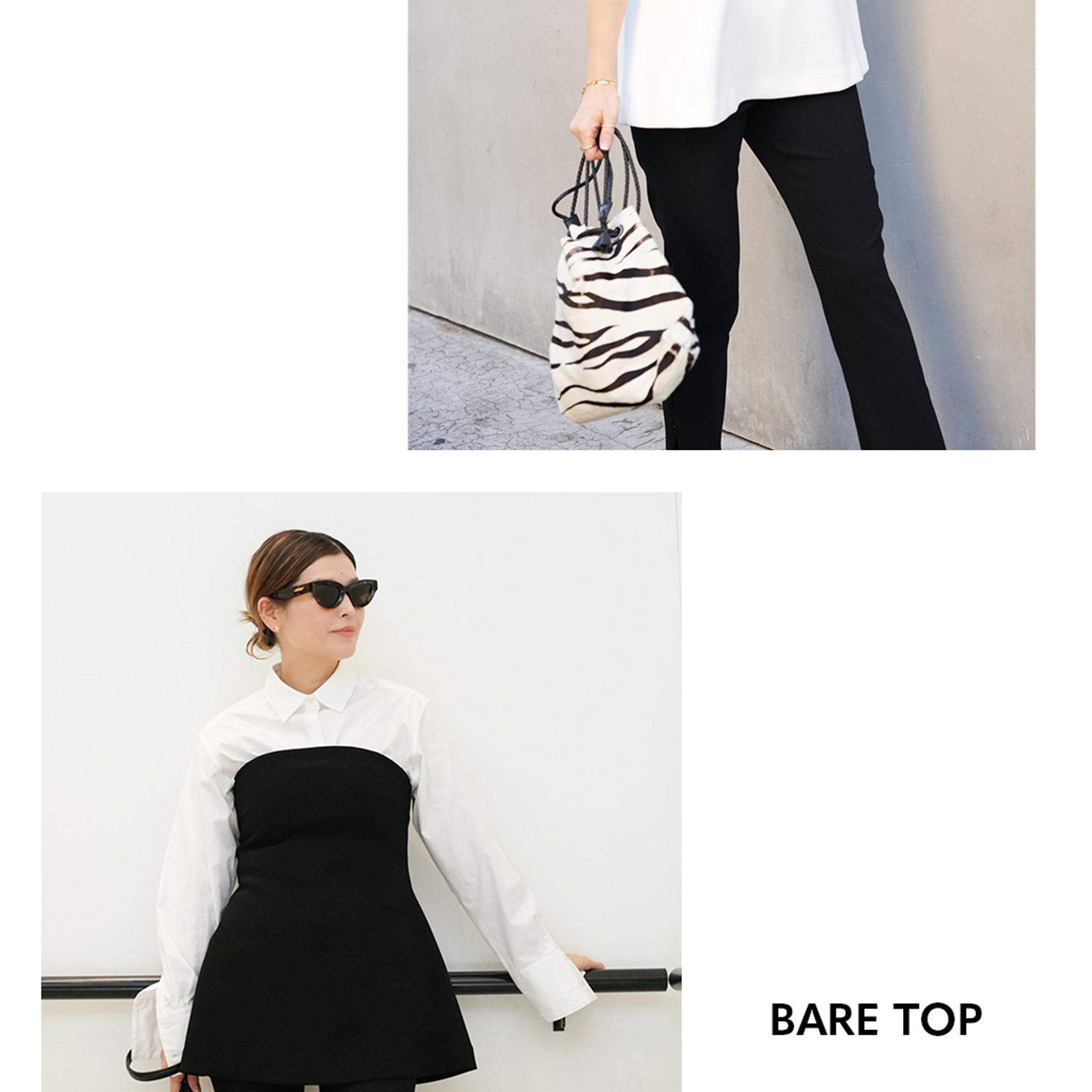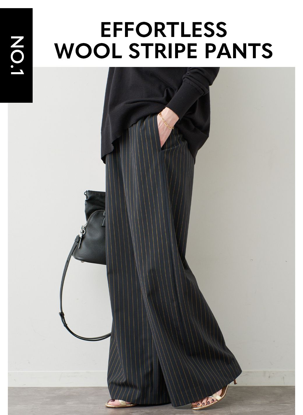 ラインをアクセントに効かせながらウエストを隠した着方を選べばただただ美しいパンツスタイルにも。