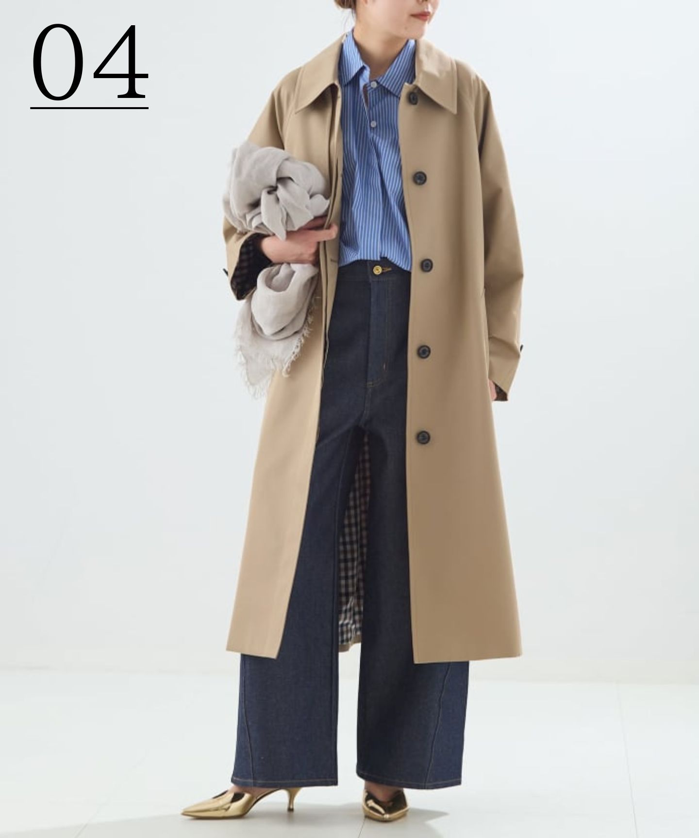 お問い合わせ多数の Aquascutum × L’ESSAGE 別注ステンカラーコートが、リモデルして再登場。ゆったりとしたシルエットに、衿元や袖にもほどよく余裕を持たせ、裾に向かって広がるモダンなバランスに仕上げました。たっぷりとした着丈でリラックス感があり、今の気分のスタイリングにも自然に馴染むデザイン。今シーズンは 一部店舗+WEB限定 で《ブラック》も展開します。シンプルなステンカラーにガンフラップを加え、釦はあえてメンズ仕様に。オーセンティックな雰囲気を大切にしつつ、裏地の大きめチェックでモダンさもプラスしています。