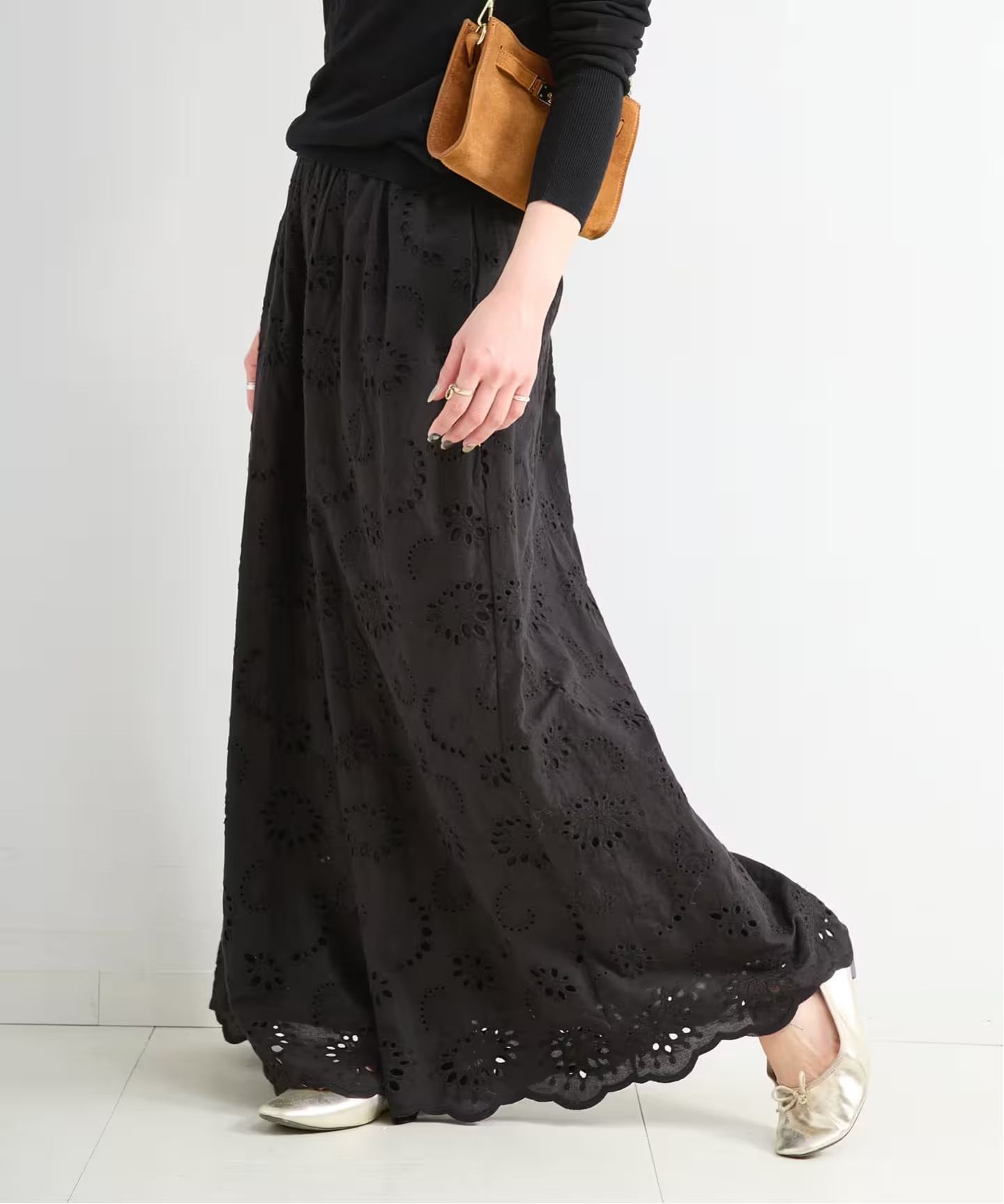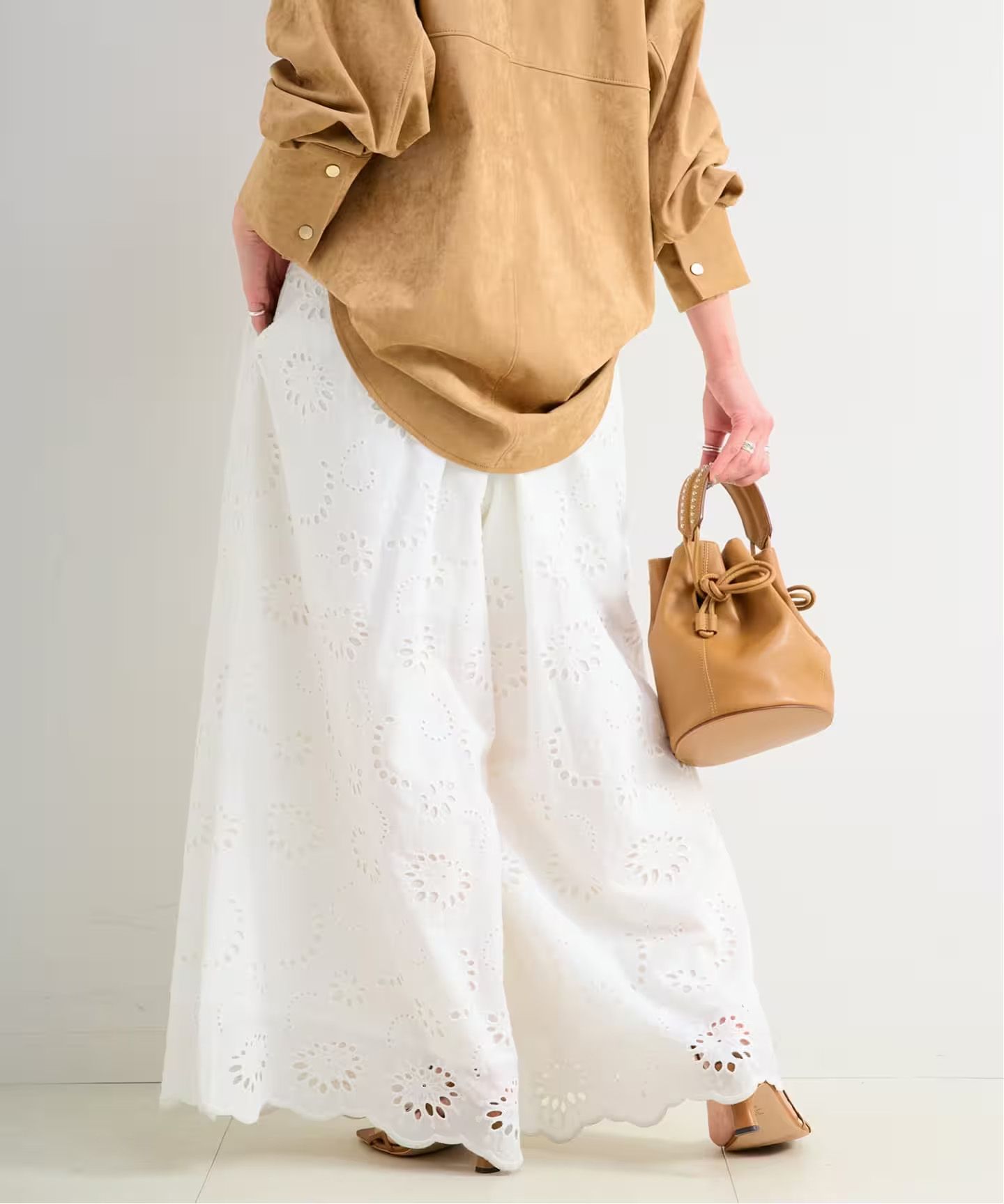 フェミニンなカットワークレース生地をふんだんに使ったイージーパンツ。