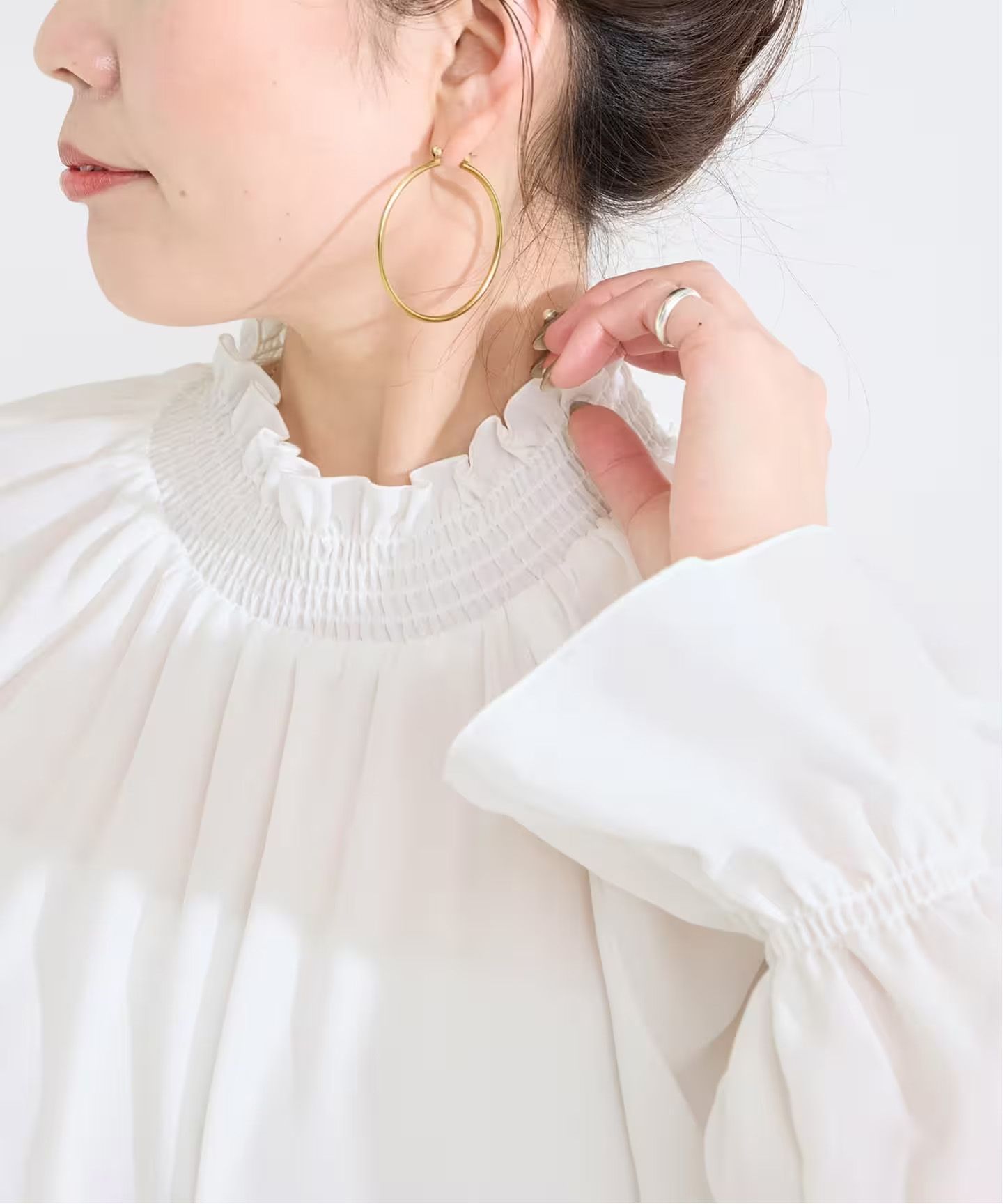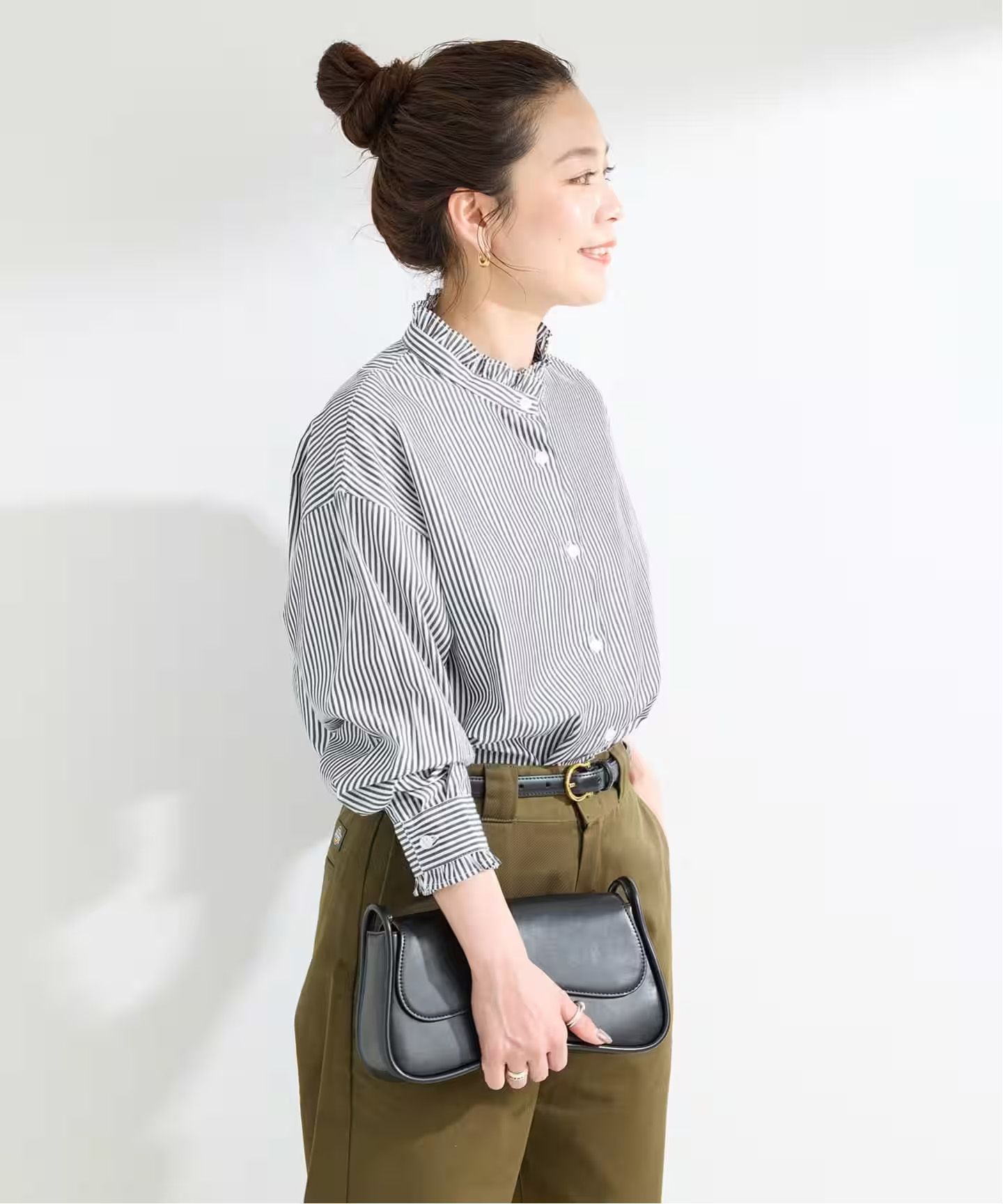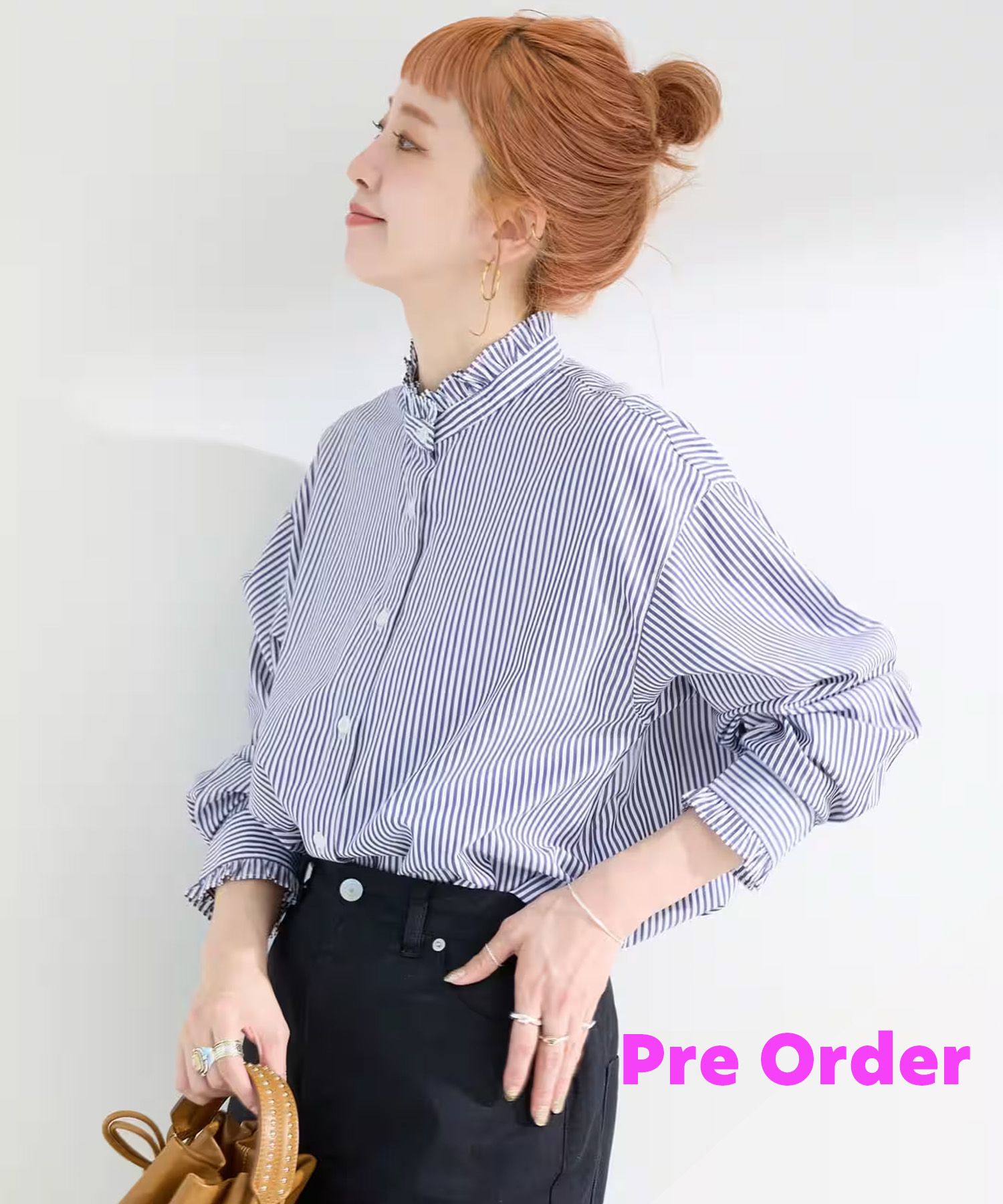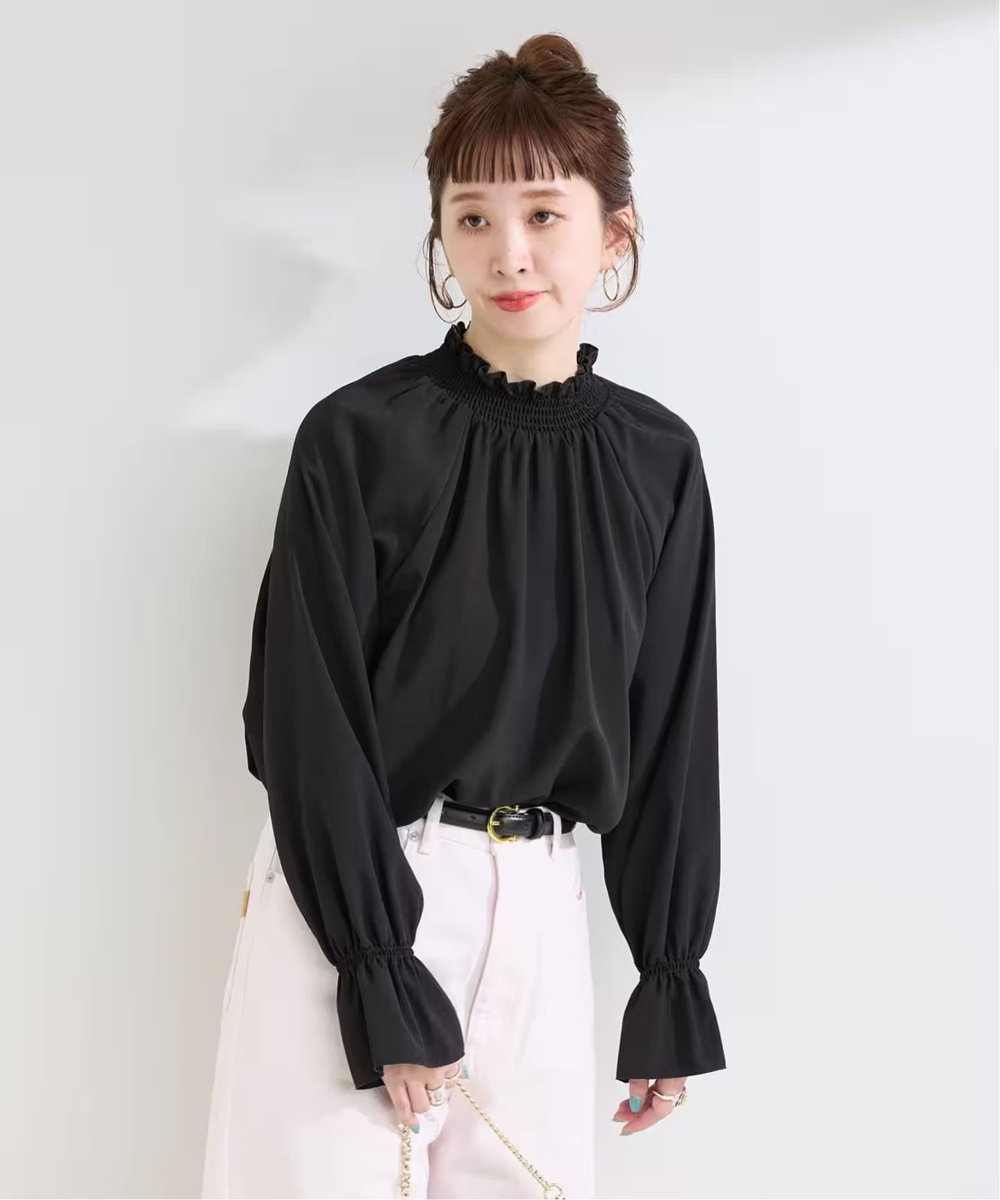 スタンドカラーに控えめなフリルをあしらった、単品使いもレイヤードもこれからの時期におすすめなアイテム。