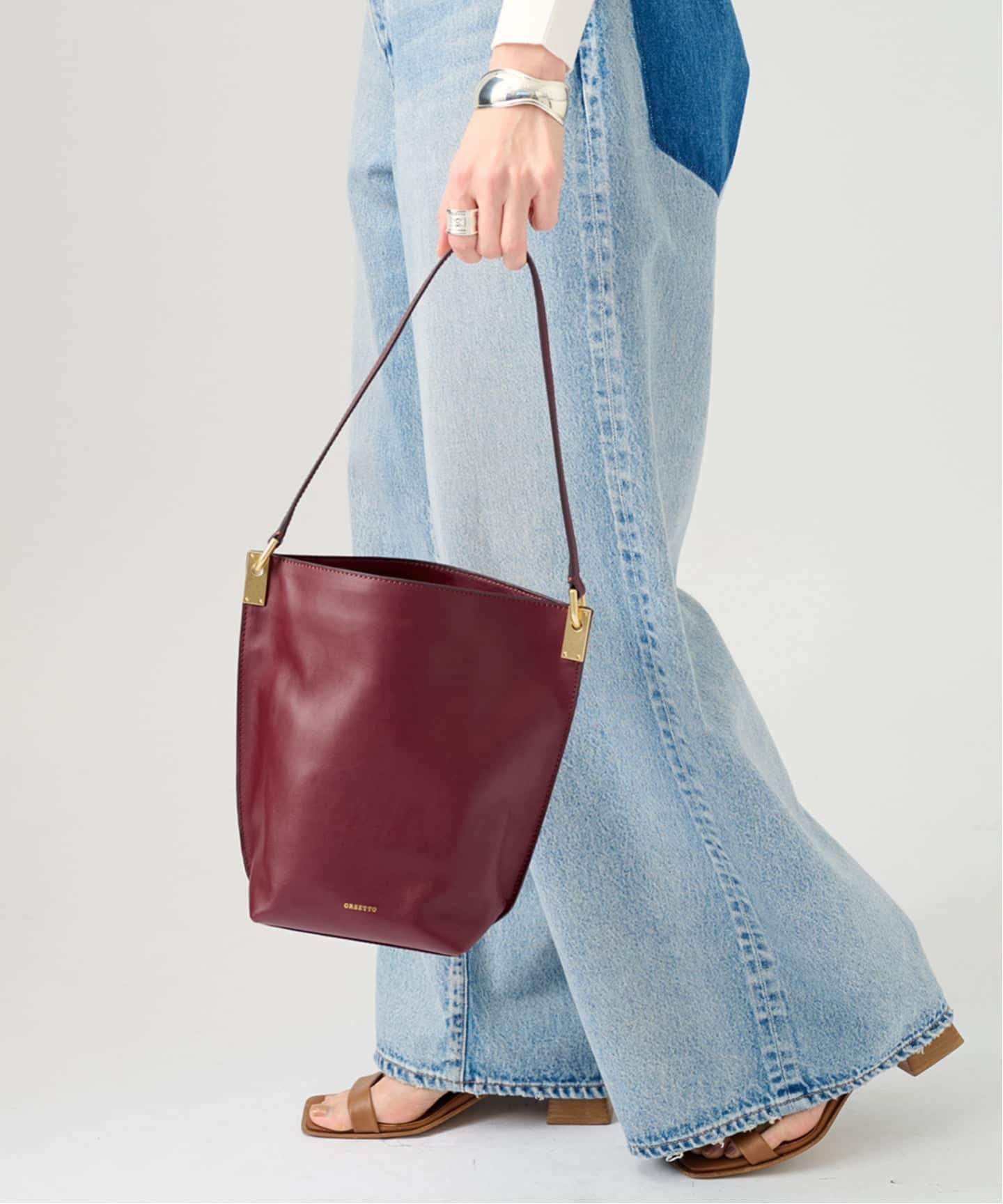 バケツ型のハンドルバッグは、手首に掛けるだけでモードな印象に。