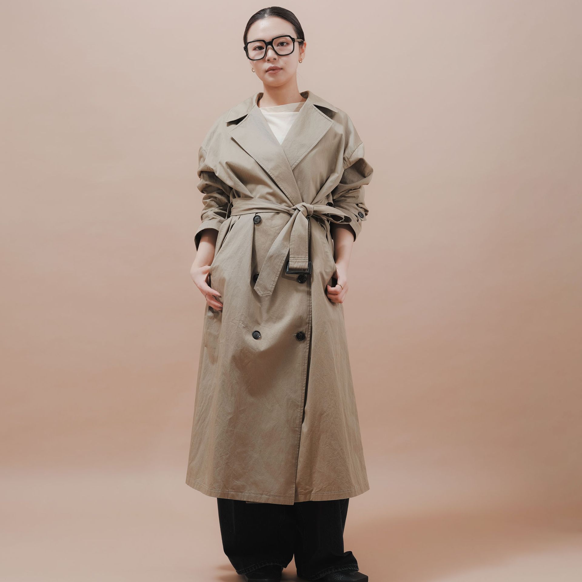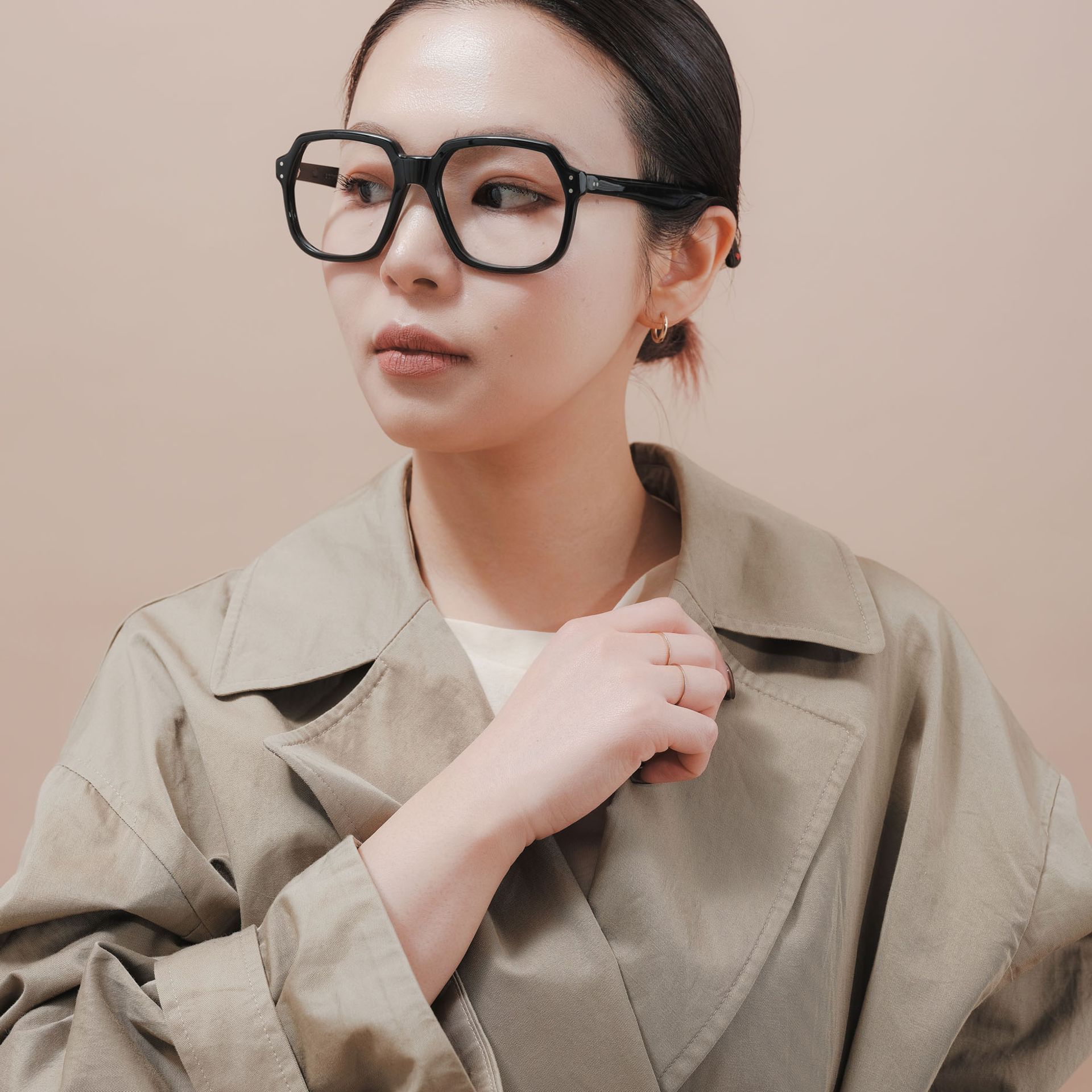 02.存在感と抜け感あるブラックフレーム。トレンチのクラシックな雰囲気にモダンなエッジをプラス。