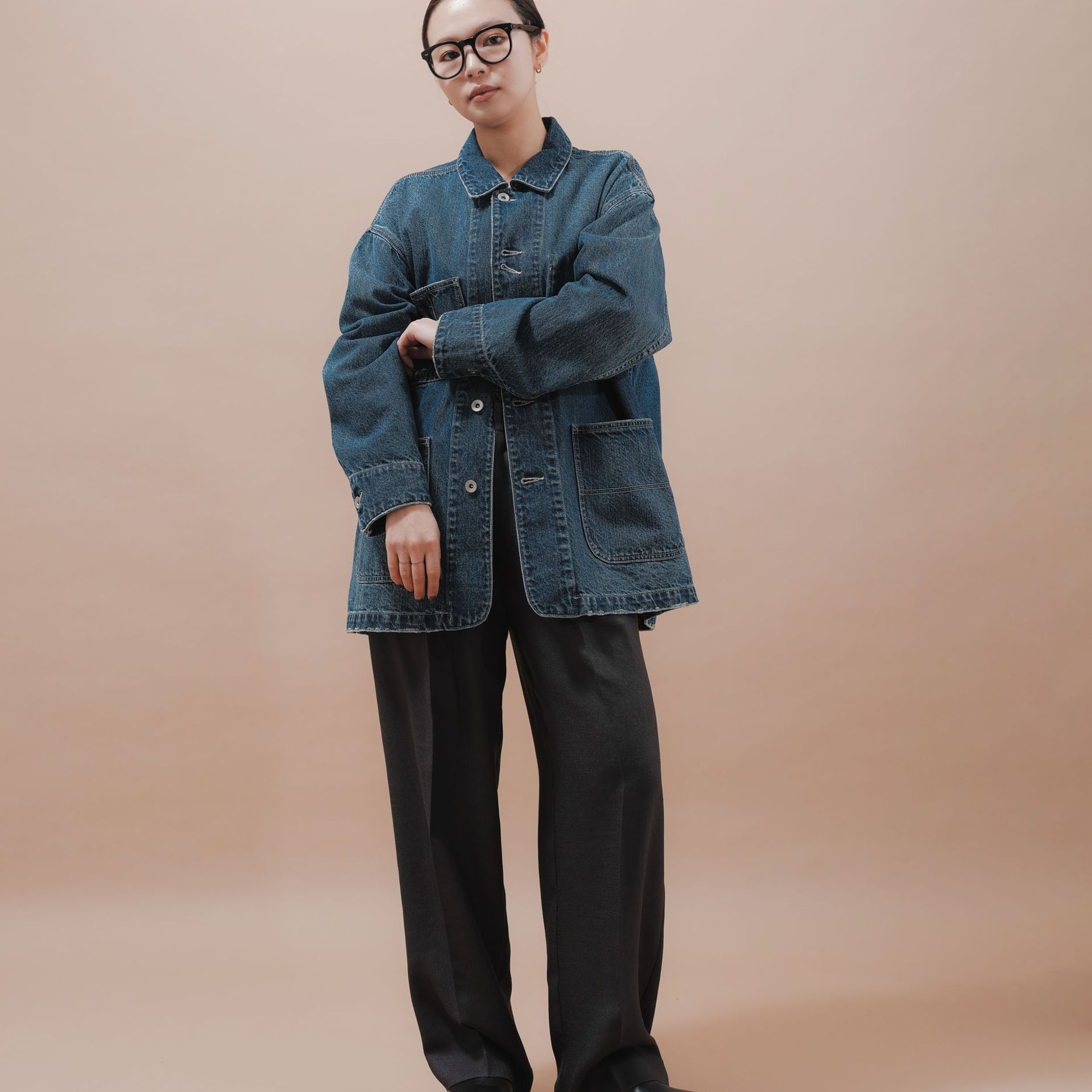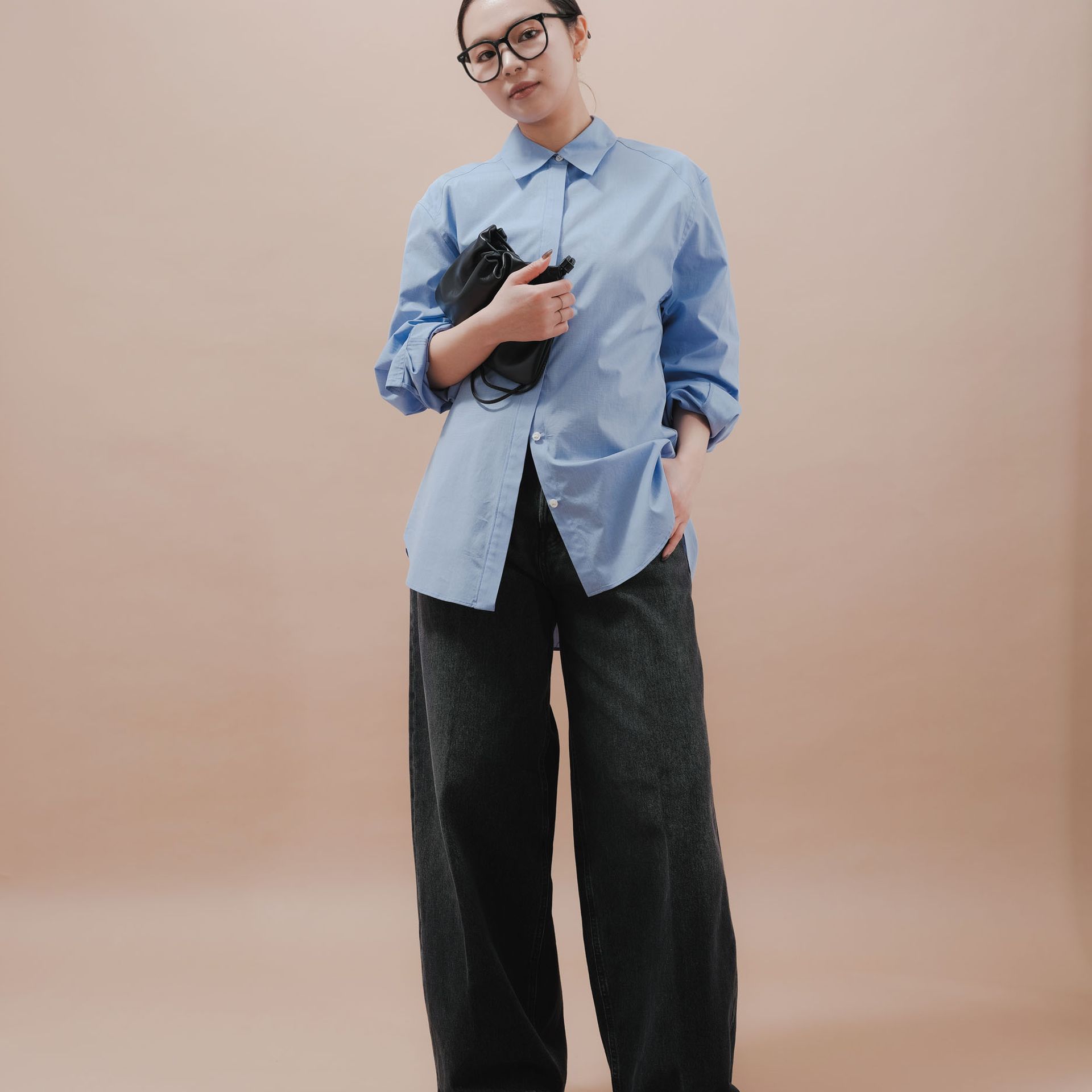 04.ゆったりと抜けのある柔らかな曲線のブラックフレーム。クリーンなブルーシャツにラフなワイドデニムとのアイウェアのバランスが全体をスマートな印象に仕上げてくれます。