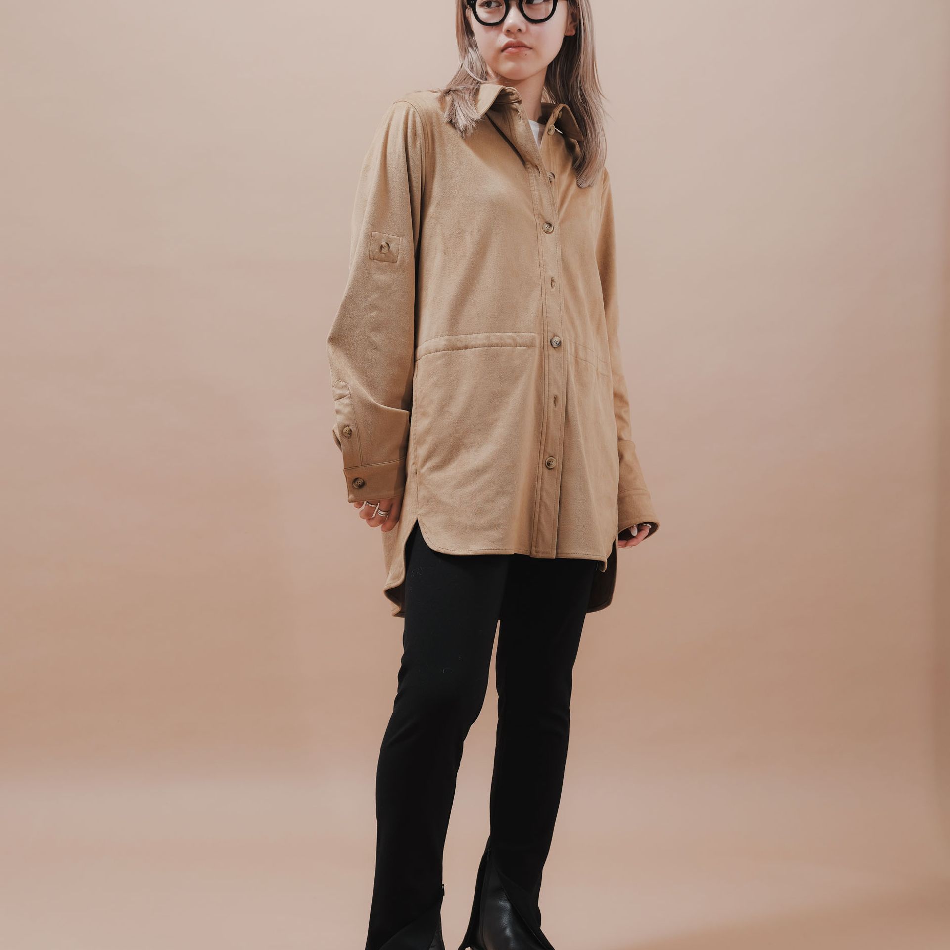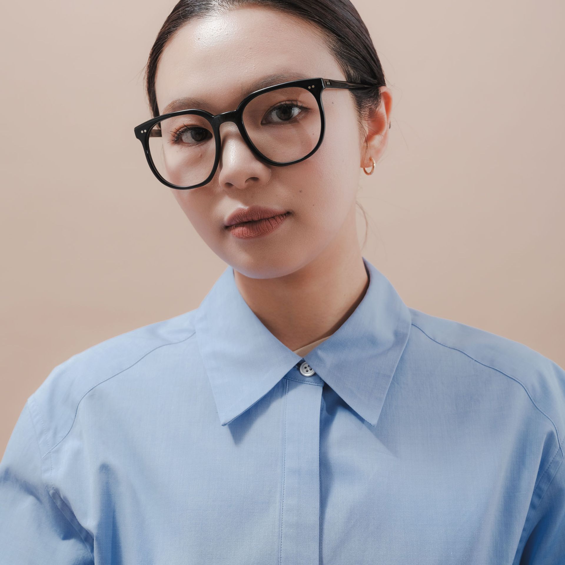 01.-太めのブラックフレームがコーディネート全体を引き締め、柔らかなベージュシャツとのコントラストで知的かつモードな印象に。