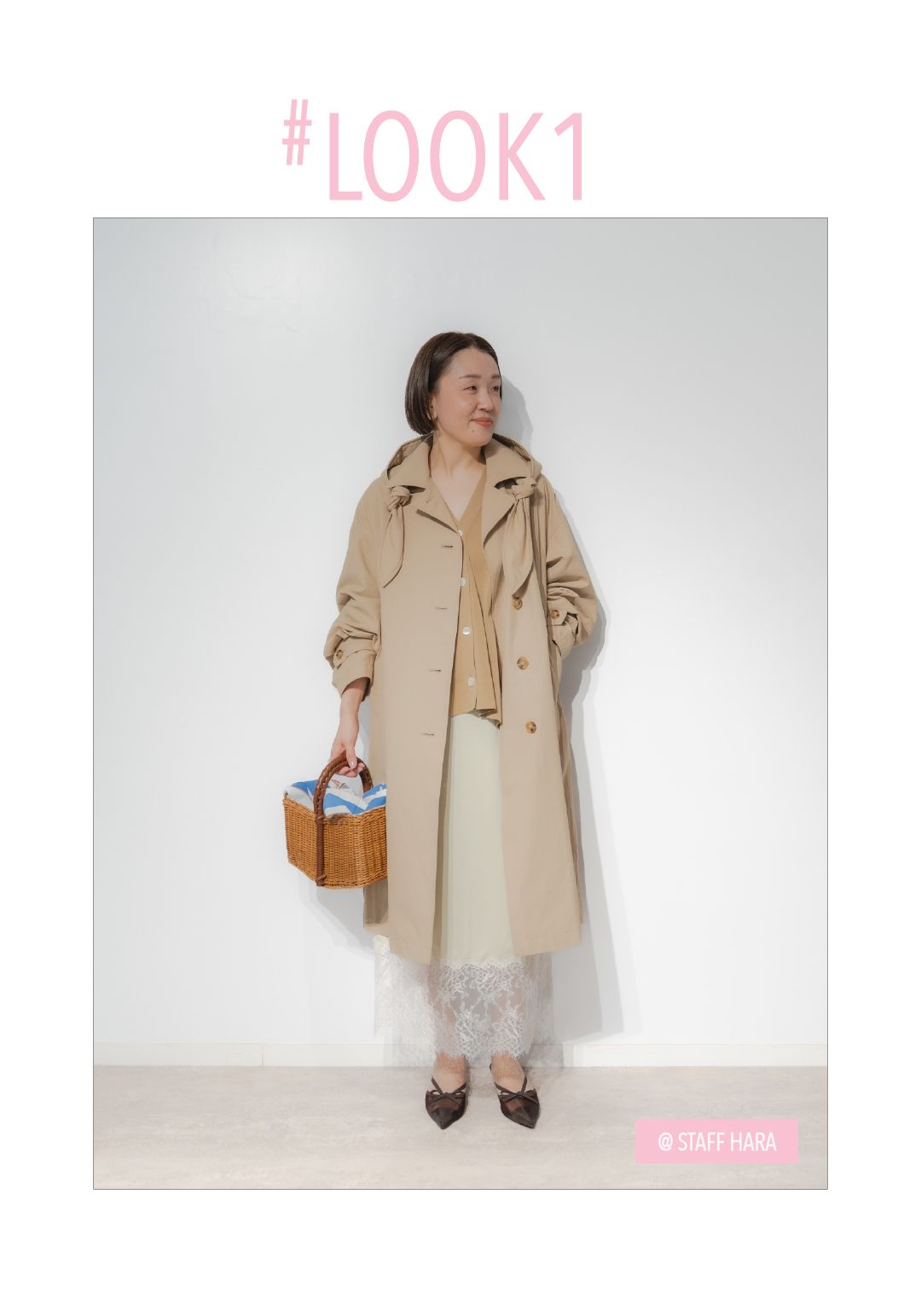 まず初めは軽やかな着心地の撥水ステンカラーコートから。スタッフ原が気になっていたレーススカートを軸にコーディネートを組んでいただきました。繊細なレースの雰囲気を活かしながらも、甘くなりすぎない絶妙なバランスが春にぴったり。カラーの取り入れ方や素材の重ね方など、新鮮なスタイリングに。