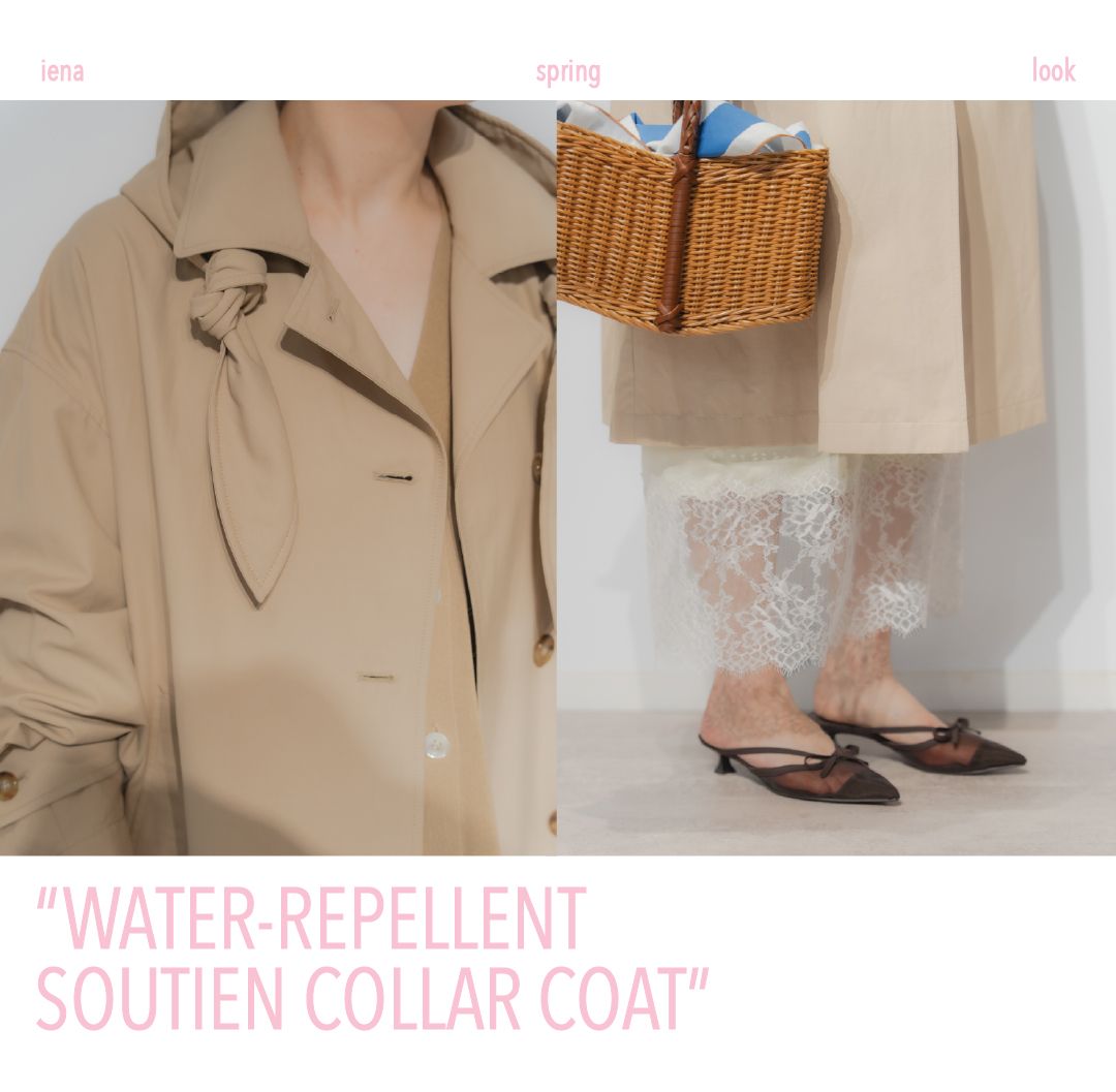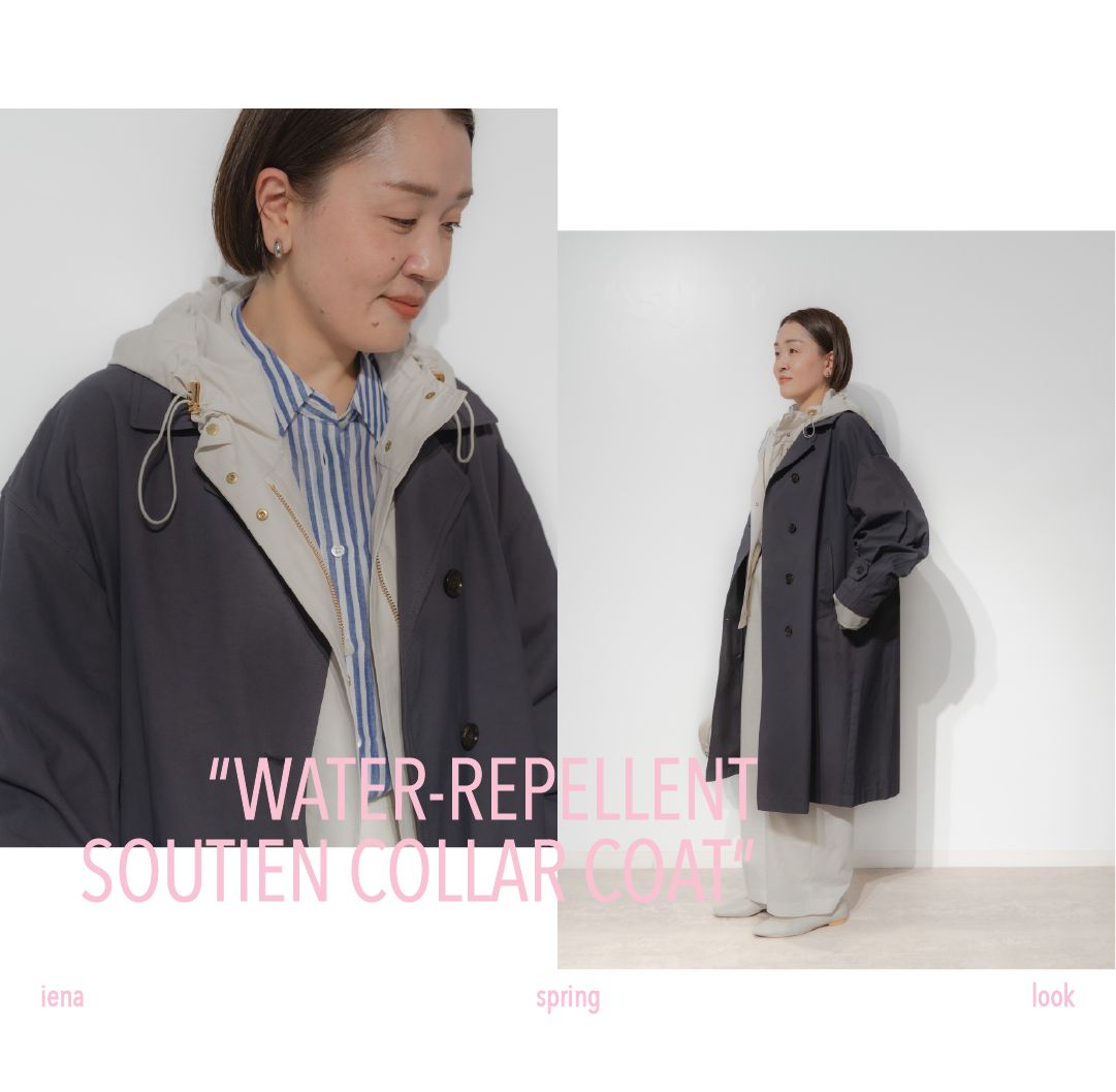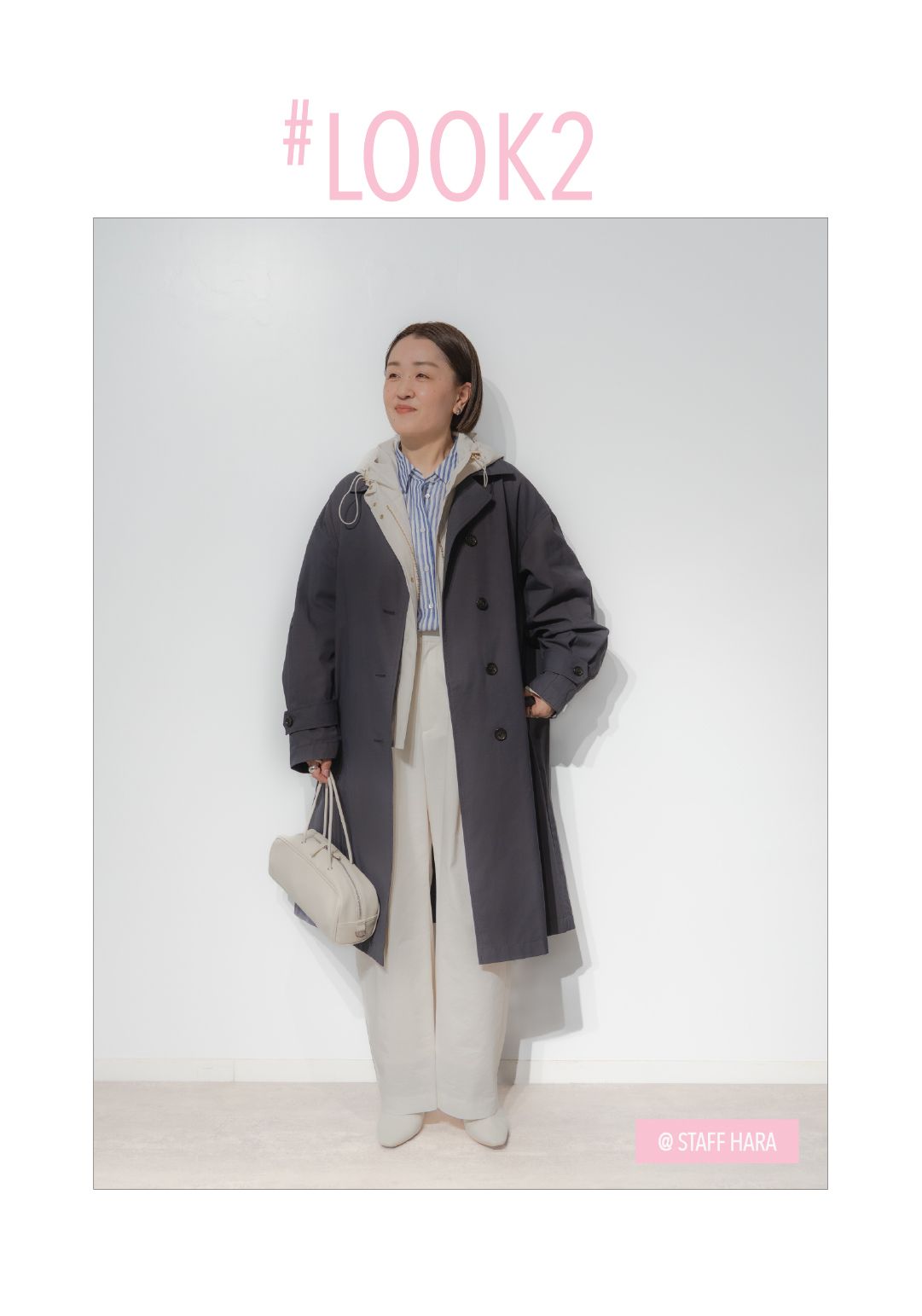 LOOK1と同じ撥水ステンカラーコートの別カラーを雰囲気を変えてコーディネート。軽やかな印象はそのままに、爽やかで凛と引き締まったバランスを意識。カジュアルベーシック派にもおすすめのスタイリングです。
