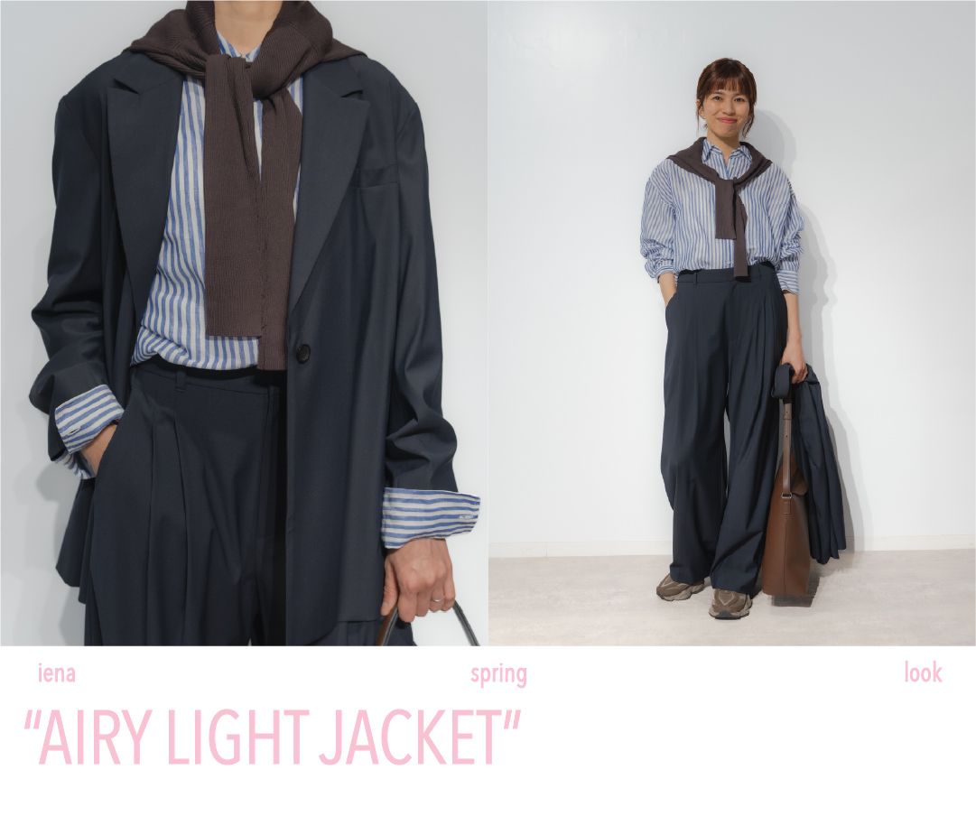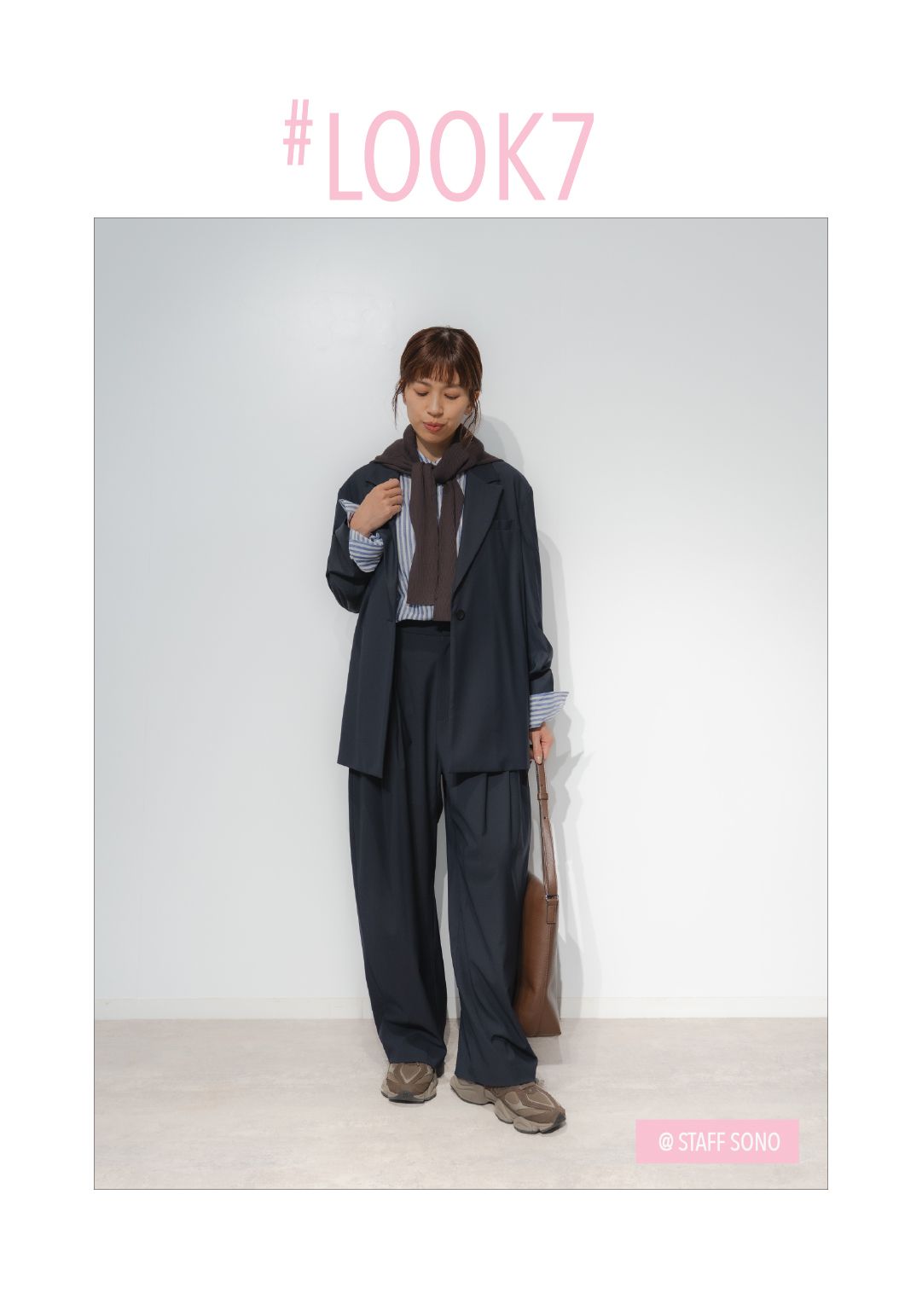 お仕事にもプライベートにも兼用できるジャケット。軽い素材感を活かしてインナーのシャツも同様に柔らかいものをセレクト。大きめバッグと、肩掛けしたカーディガンがスタイリングのスパイスとして全体をまとめてくれます。きちんと感がありながらも、今年らしい新しいワークスタイルに。