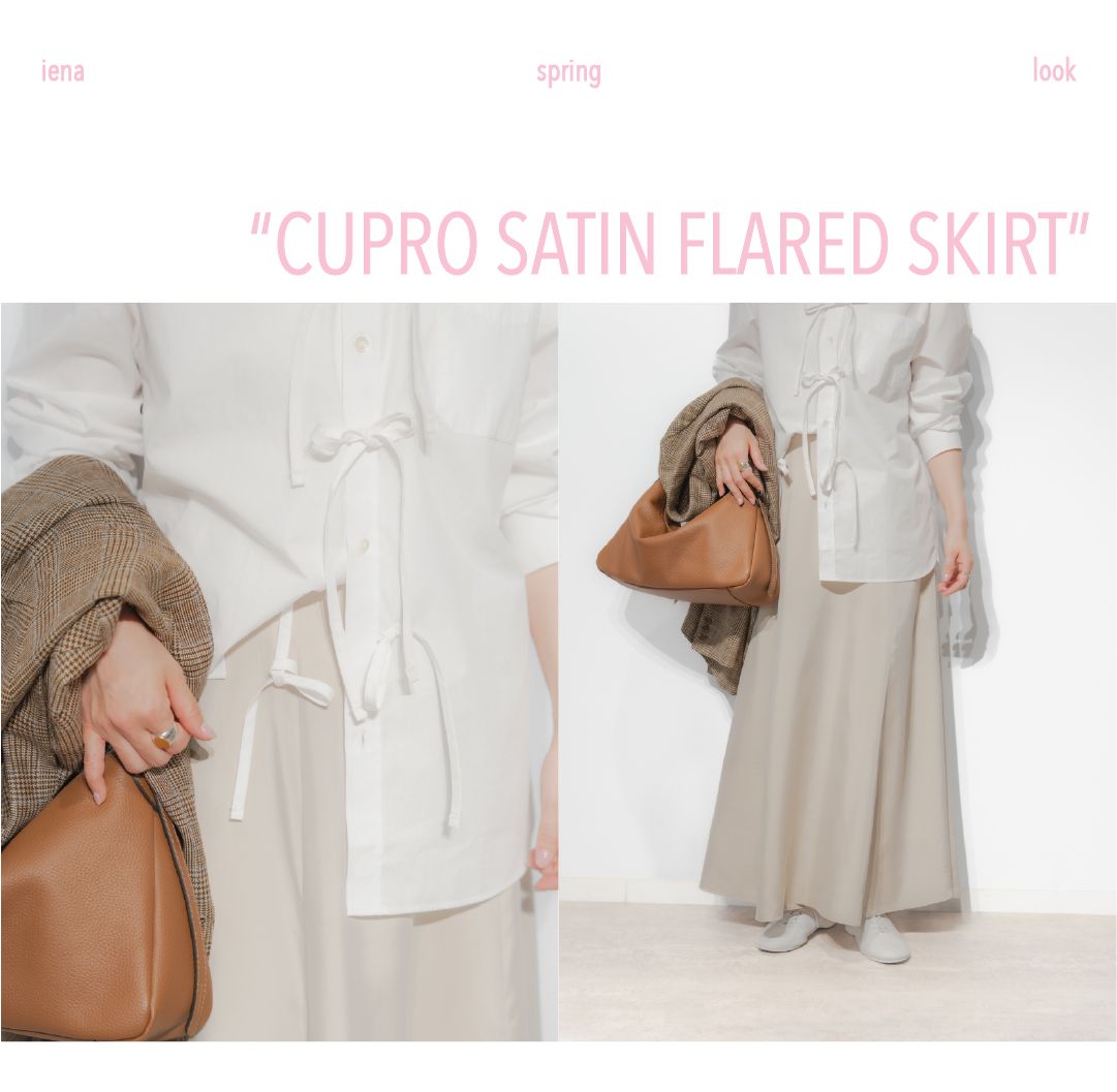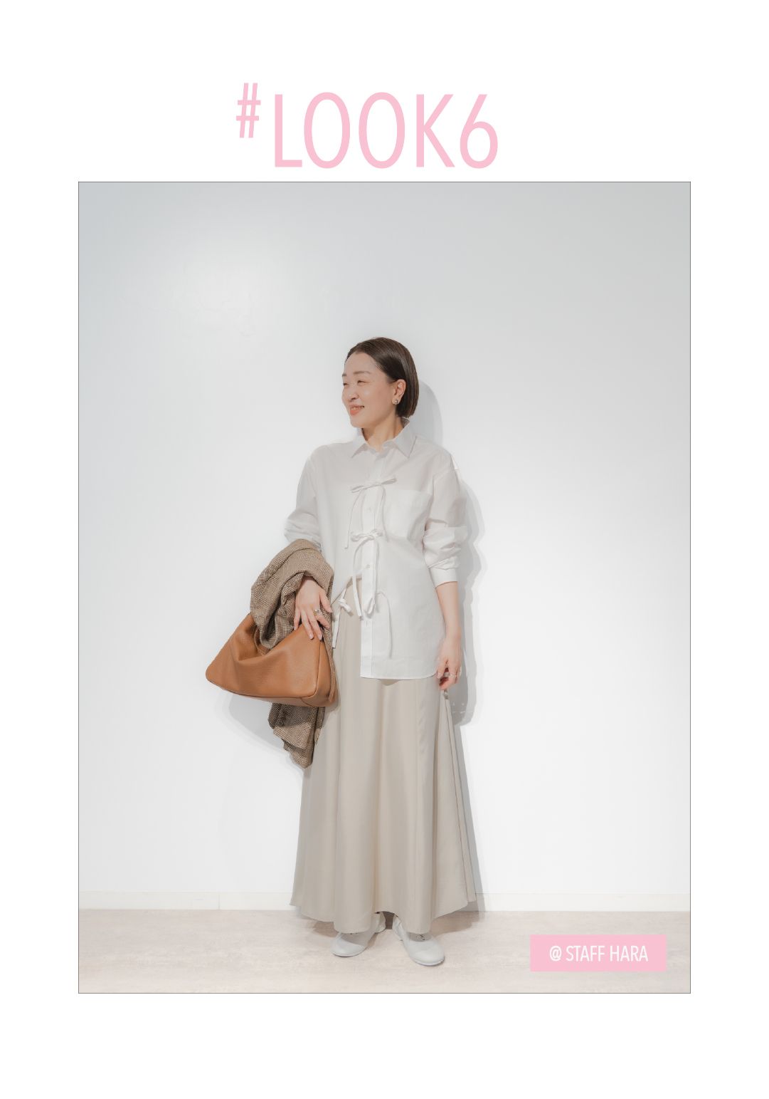 長めの丈感を持つキュプラサテンスカートは動いたときの美しいシルエットが魅力。ニットとの合わせも素敵ですが、今回はデザイン性のあるシャツを合わせて少しカジュアルに。きちんと感がありながらも、抜けのあるバランスに仕上げています。リボンの結び方にも注目。最後の仕上げには仕立てのきれいなジャケットをさらりと。