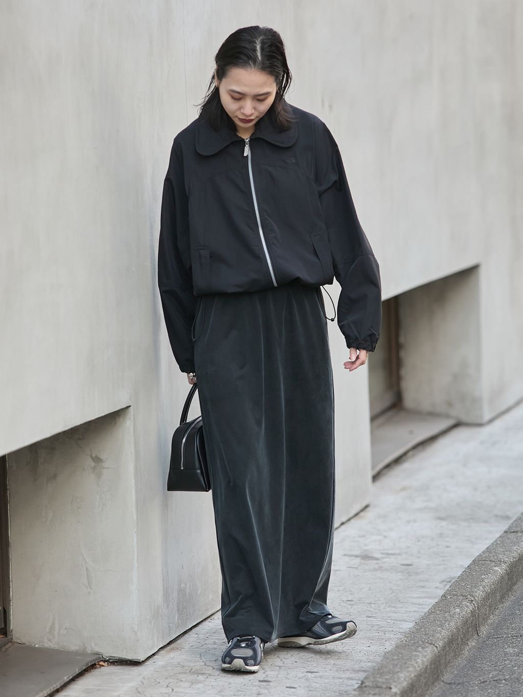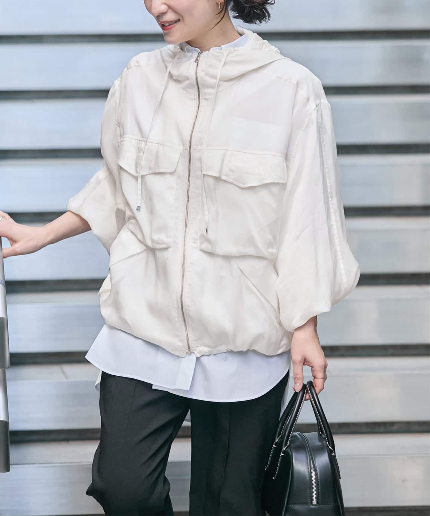 裾をドローストリング仕様にしており、裾をぎゅっと絞るとバルーンシルエットになり肩回りがより立体的なシルエットに。