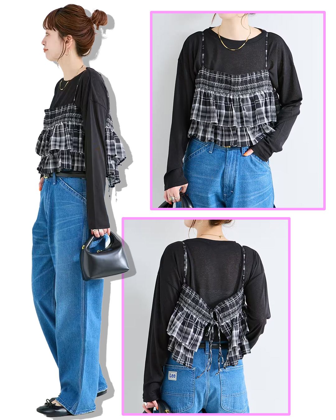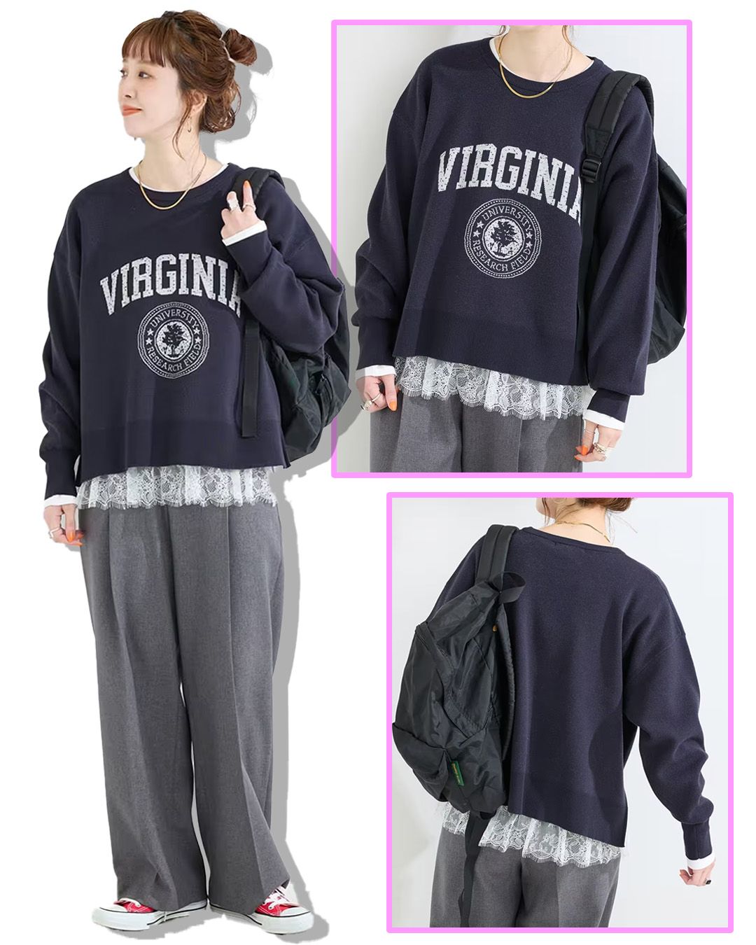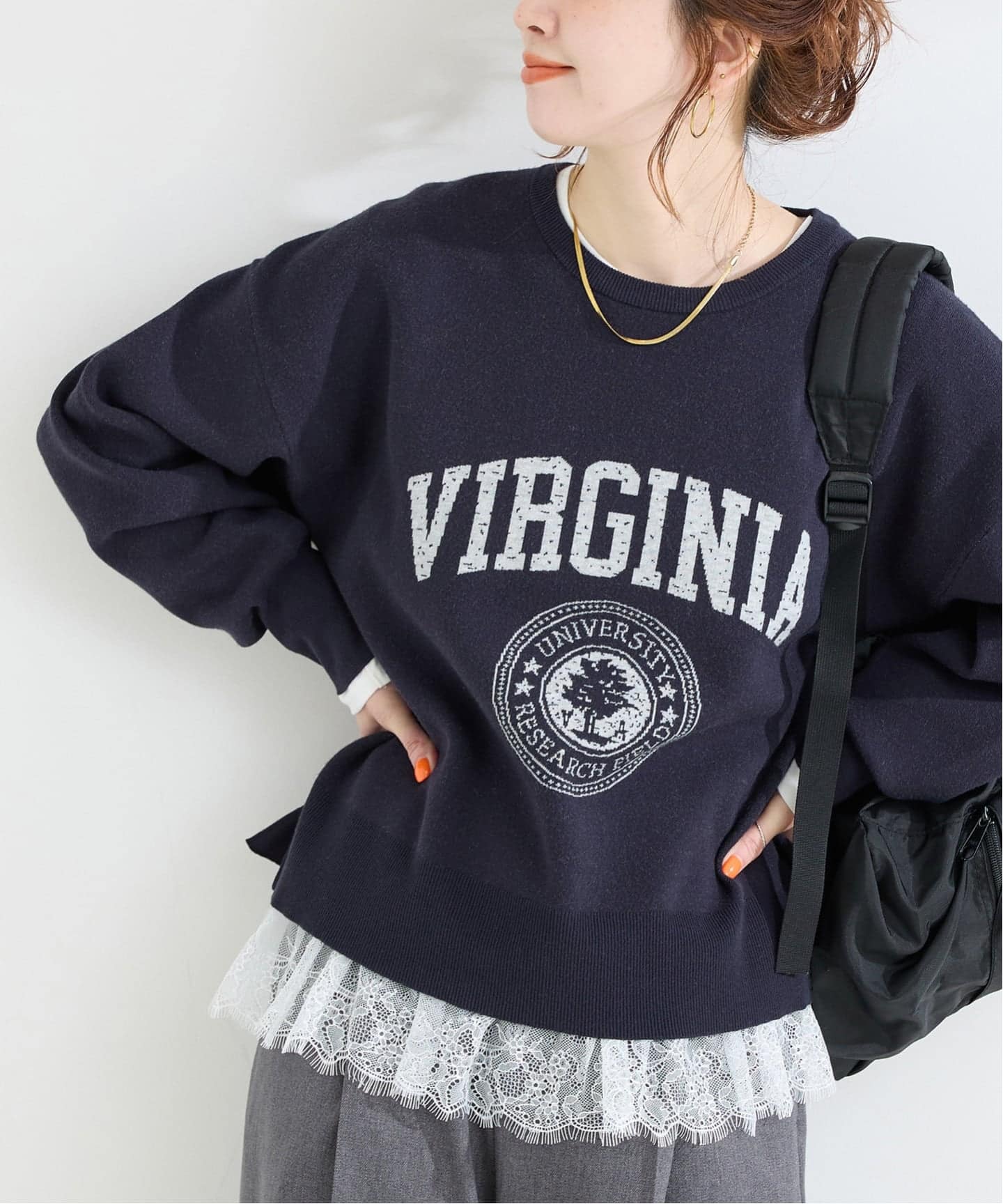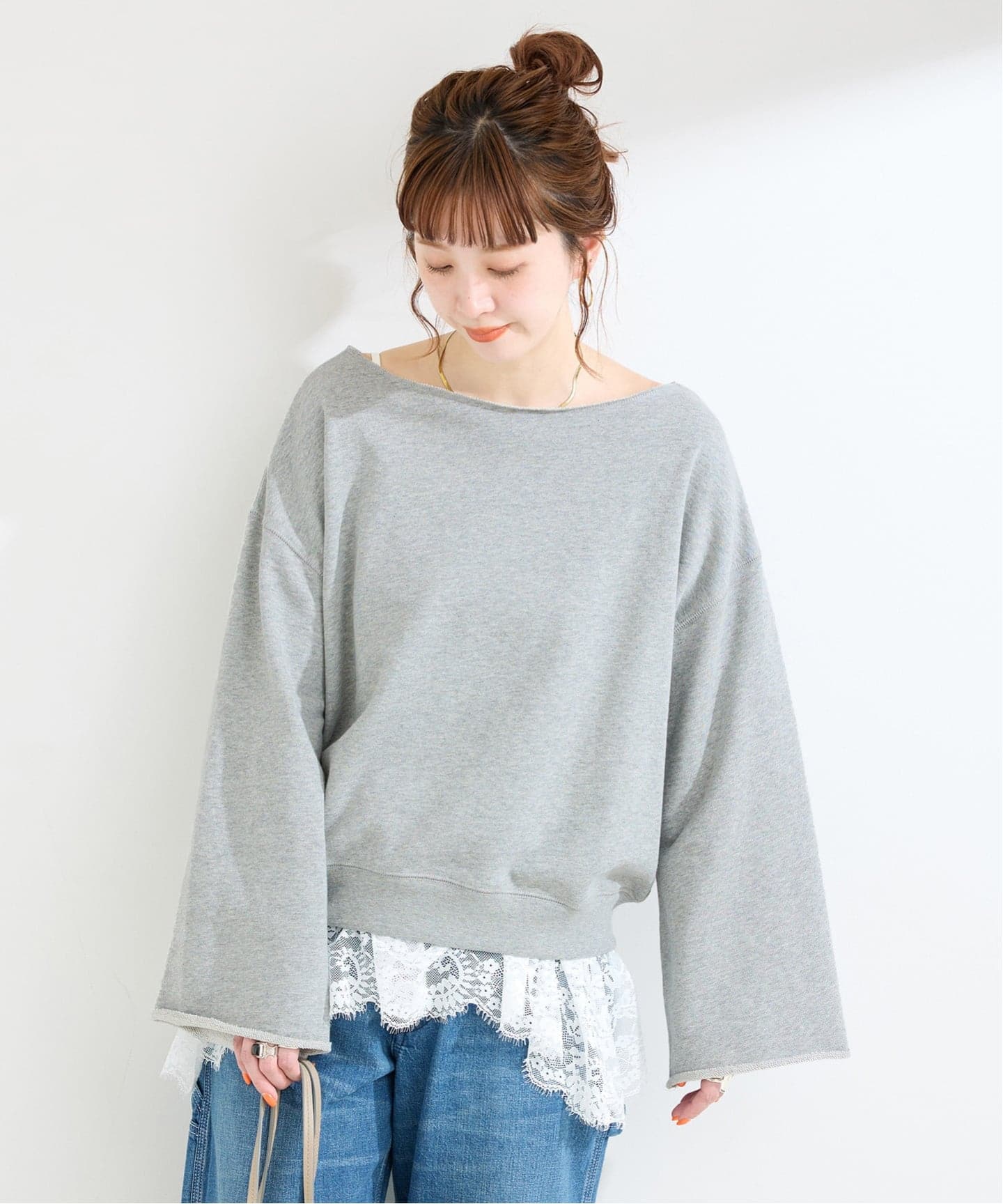 インナーとしても着用しやすいようサイズバランスにこだわり、甘すぎず大人っぽいフェミニンさをさりげなく演出してくれる一枚です。ニットやスウェットの裾から、レースをちらっと覗かせるレイヤードスタイルがおすすめ。